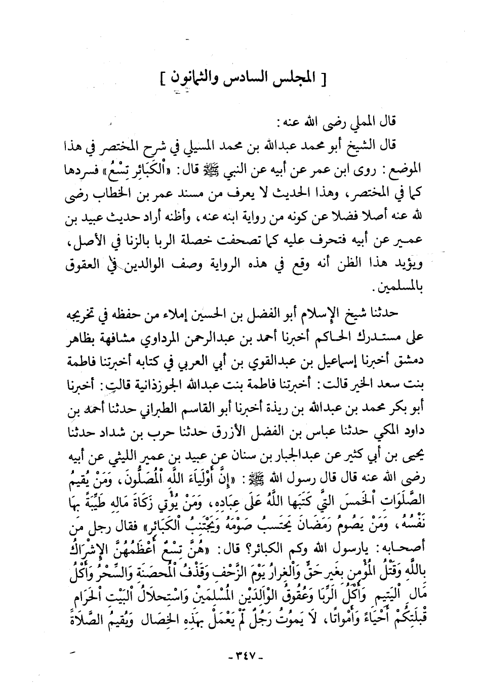 حدثنا شيخ الإسلام أبو الفضل بن الحسين إملاء من حفظه في تخريجه على مستدرك الحاكم أخبرنا أحمد بن عبد الرحمن المرداوي مشافهة بظاهر دمشق أخبرنا إسماعيل بن عبد القوي بن أبي العربي في كتابه أخبرتنا فاطمة بنت سعد الخير قالت: أخبرتنا فاطمة بنت عبد اللَّه الجوزذانية قالت: أخبرنا أبو بكر محمد بن عبد اللَّه بن ريذة أخبرنا أبو القاسم الطبراني حدثنا أحمد بن داود المكي حدثنا عباس بن الفضل الأزرق حدثنا حرب بن شداد حدثنا يحيى بن أبي كثير عن عبد الجبار بن سنان في عبيد بن عمير الليثي عن أبيه رضي اللَّه عنه قال قال رسول اللَّه -صلى اللَّه عليه وسلم-: "إِنَّ أَوْلَياءَ اللَّه المُصَلَّونَ، وَمَنْ يُقيمُ الصَّلَوَاتِ الخَمْسَ الَّتي كَتَبَها اللَّهُ عَلَى عِبَادِهِ، وَمَنْ يُؤتي زَكَاةَ مَالِهِ طَيِّبَةً بِهَا نَفْسُهُ، وَمَنْ يَصومُ رَمَضَانَ يَحتَسبُ صَوْمَهُ وَيَجْتَنِبُ الكَبَائر" فقال رجل من أصحابه: يا رسول اللَّه وكم الكبائر؟ قال: "هُنَّ تِسْعٌ أَعْظَمُهُنَّ الإِشْرَاكُ بِاللَّهِ وَقتلُ المُؤْمِن بغَير حَقٍّ وَالغِرارُ يَوْمَ الزَّحْفِ وَقَذْفُ المُحصَنَةِ وَالسِّحْرُ وَأَكْلُ مَالِ اليَتيمِ وَأَكْلُ الرِّبَا وَعُقُوقُ الوْالِدَيْن المُسْلِمَينْ وَاسْتِحلَالُ البَيْتِ الحَرَام قبْلَتِكُمْ أَحْيَاءً وَأَمْواتًا، لَا يَموُتُ رَجُلٌ لَمْ يَعْمَلْ بِهَذِهِ الخِصَال وَيُقيمُ الصَّلَاةَ