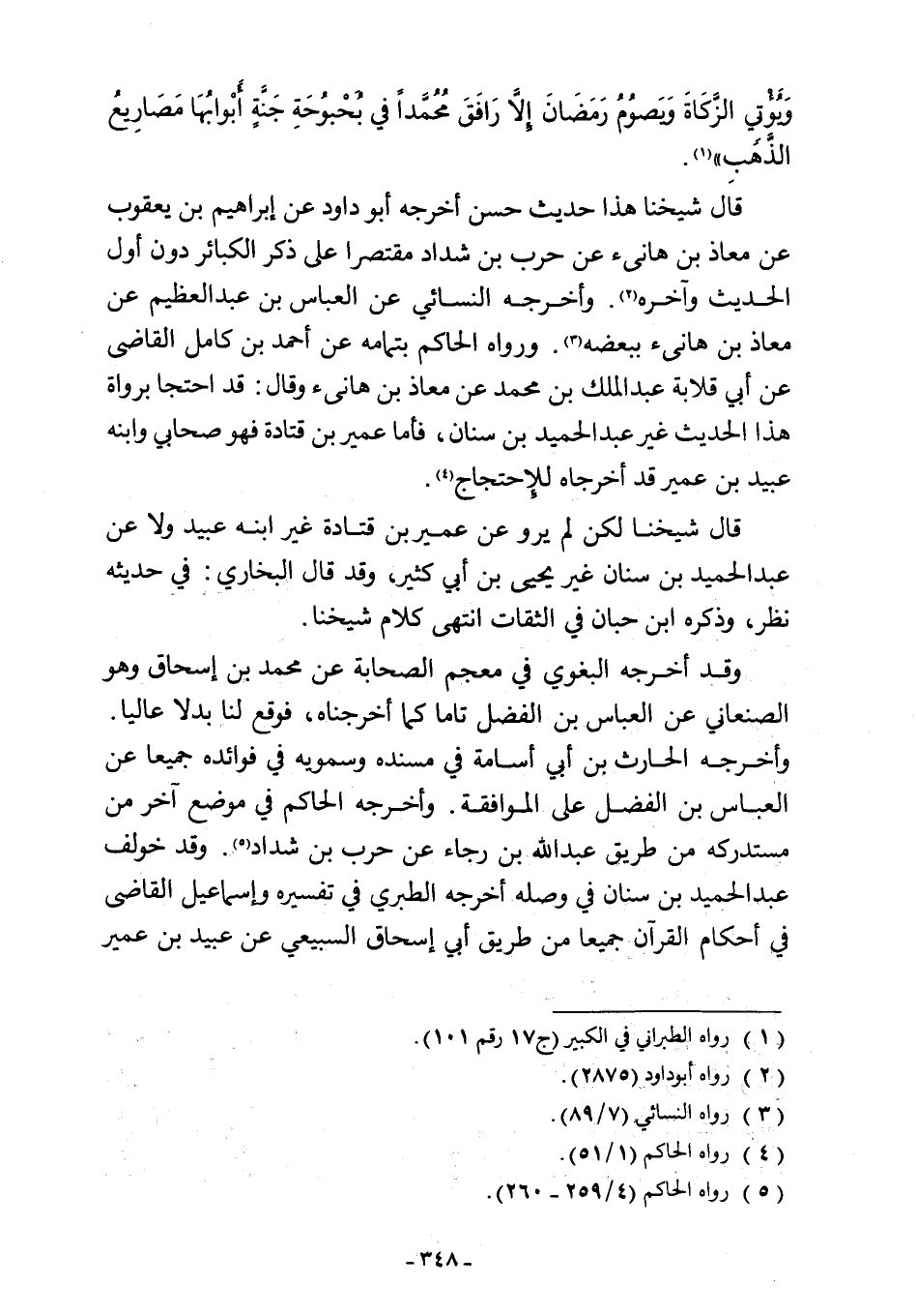 قال شيخنا هذا حديث حسن أخرجه أبو داود عن إبراهيم بن يعقوب عن معاذ بن هانئ عن حرب بن شداد مقتصرًا على ذكر الكبائر دون أول الحديث وآخره (¬2). وأخرجه النسائي عن العباس بن عبد العظيم عن معاذ بن هانئ ببعضه (¬3). ورواه الحاكم بتمامه عن أحمد بن كامل القاضي عن أبي قلابة عبد الملك بن محمد عن معاذ بن هانئ وقال: قد احتجا برواة هذا الحديث غير عبد الحميد بن سنان، فأما عمير بن قتادة فهو صحابي وابنه عبيد بن عمير قد أخرجاه للإحتجاج (¬4).