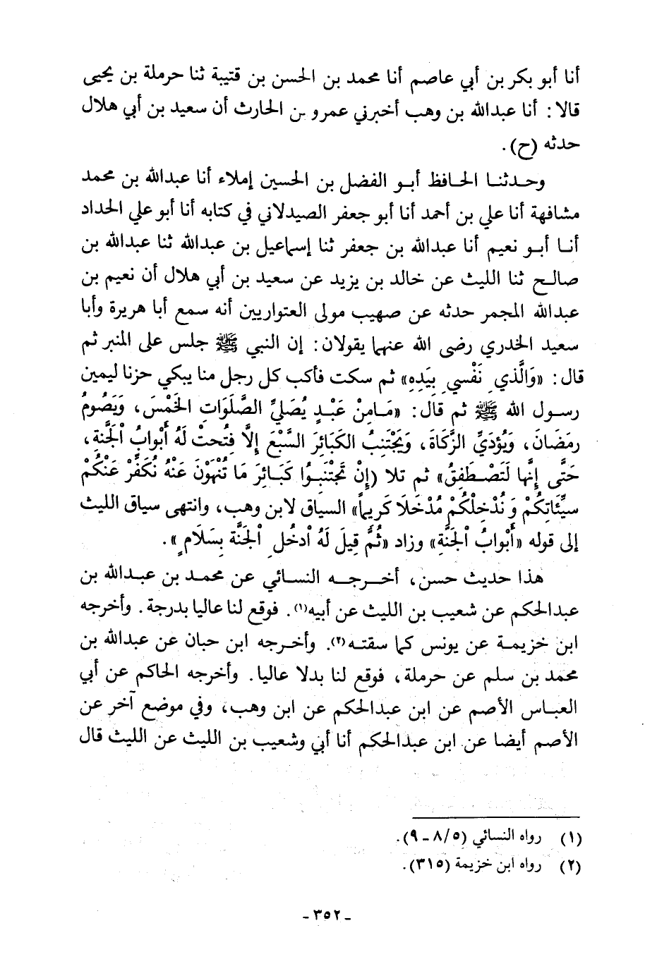 وحدثنا الحافظ أبو الفضل بن الحسين إملاء أنا عبد اللَّه بن محمد مشافهة أنا علي بن أحمد أنا أبو جعفر الصيدلاني في كتابه أنا أبو علي الحداد أنا أبو نعيم أنا عبد اللَّه بن جحفر ثنا إسماعيل بن عبد اللَّه ثنا عبد اللَّه بن صالح ثنا الليث عن خالد بن يزيد عن سعيد بن أبي هلال أن نعيم بن عبد اللَّه المجمر حدثه عن صهيب مولى العتواريين أنه سمع أبا هريرة وأبا سعيد الخدري رضي اللَّه عنهما يقولان: إن النبي -صلى اللَّه عليه وسلم- جلس على المنبر ثم قال: "وَالَّذي نَفْسي بيَدِهِ" ثم سكت فأكب كل رجل منا يبكي حزنا ليمين رسول اللَّه -صلى اللَّه عليه وسلم- ثم قال: "مَا مِنْ عَبْدٍ يُصَلِّي الصَّلَوَات الخَمْسَ، وَيَصُومُ رمَضَانَ، وَيُؤَدِيِّ الزَّكَاةَ، وَيَجْتَنِبُ الكَبَائِرَ السَّبْعَ إِلَّا فُتِحَتْ لَهُ أبْوابُ الجَنَّةِ، حَتَّى إِنَّها لَتَصْطَفِقُ" ثم تلا {إِنْ تَجْتَنِبُوا كَبَائِرَ مَا تُنْهَوْنَ عَنْهُ نُكَفِّرْ عَنْكُمْ سَيِّئَاتِكُمْ وَنُدْخِلْكُمْ مُدْخَلًا كَرِيمًا} " السياق لابن وهب، وانتهى سياق الليث إلى قوله "أبْوابُ الجَنةِ" وزاد "ثُمَّ قِيلَ لَهُ ادْخُلِ الجَنَّة بِسَلَامٍ".