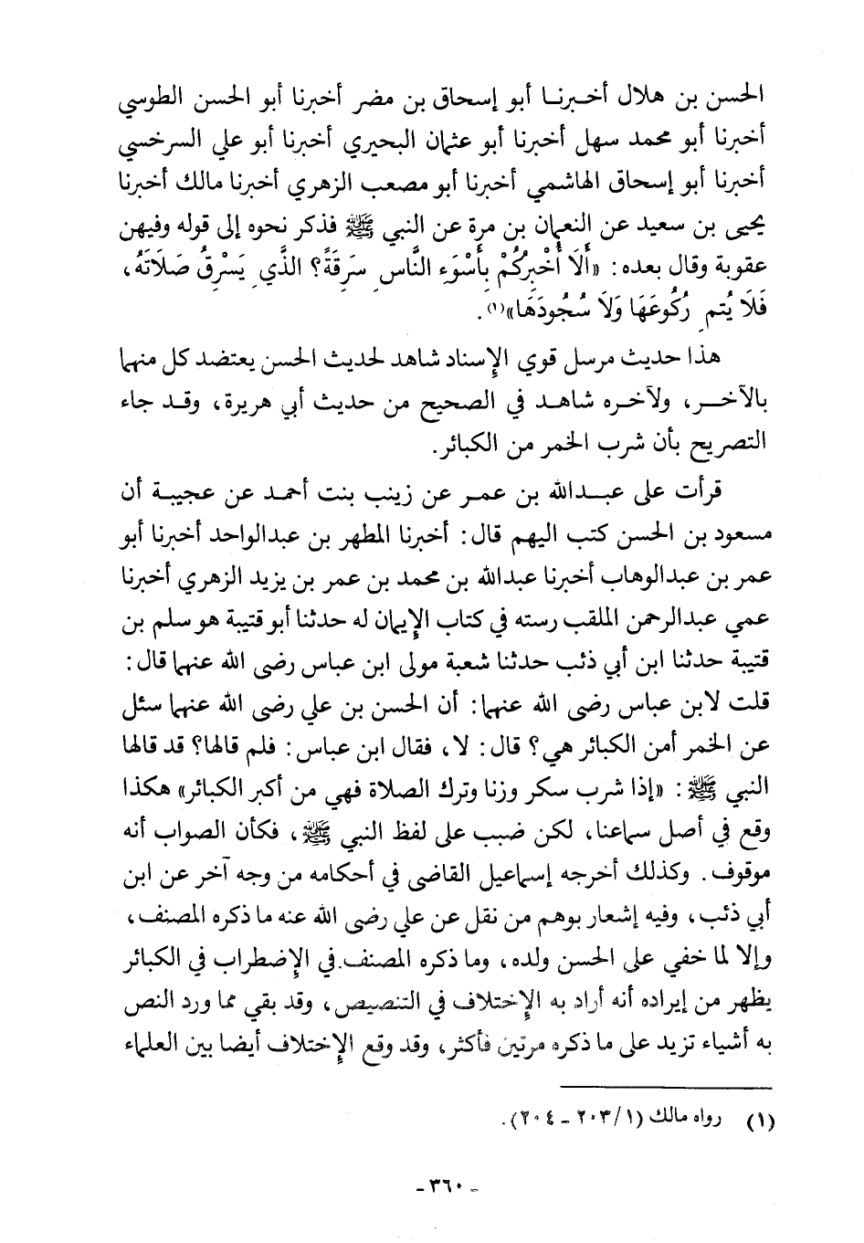 قرأت على عبد اللَّه بن عمر عن زينب بنت أحمد عن عجيبة أن مسعود بن الحسن كتب اليهم قال: أخبرنا المطهر بن عبد الواحد أخبرنا أبو عمر بن عبد الوهاب أخبرنا عبد اللَّه بن محمد بن عمر بن يزيد الزهري أخبرنا عمي عبد الرحمن الملقب رسته في كتاب الإيمان له حدثنا أبو قتيبة هو سلم بن قتيبة حدثنا ابن أبي ذئب حدثنا شعبة مولى ابن عباس رضي اللَّه عنهما قال: قلت لابن عباس رضي اللَّه عنهما: أن الحسن بن علي رضي اللَّه عنهما سئل عن الخمر أمن الكبائر هي؟ قال: لا، فقال ابن عباس: فلم قالها؟ قد قالها النبي -صلى اللَّه عليه وسلم-: "إذا شرب سكر وزنا وترك الصلاة فهي من أكبر الكبائر" هكذا وقع في أصل سماعنا، لكن ضبب على لفظ النبي -صلى اللَّه عليه وسلم-، فكأن الصواب أنه موقوف. وكذلك أخرجه إسماعيل القاضى في أحكامه من وجه آخر عن ابن أبي ذئب، وفيه إشعار بوهم من نقل عن علي رضي اللَّه عنه ما ذكره المصنف، وإلا لما خفي على الحسن ولده، وما ذكره المصنف في الإضطراب فى الكبائر يظهر من إيراده أنه أراد به الإختلاف في التنصيص, وقد بقي مما ورد النص به أشياء تزيد على ما ذكره مرتين فأكثر, وقد وقع الإختلاف أيضا بين العلماء