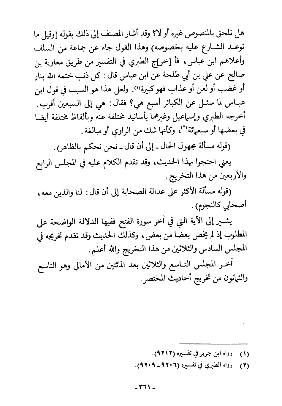 هل تلحق بالمنصوص غيره أو لا؟ وقد أشار المصنف إلى ذلك بقوله [وقيل ما توعد الشارع عليه بخصوصه] وهذا القول جاء عن جماعة من السلف وأعلاهم ابن عباس، فأ [خر] ج الطبري في التفسير من طريق معاوية بن صالح عن علي بن أبي طلحة عن ابن عباس قال: كل ذنب ختمه اللَّه بنار أو غضب أو لعن أو عذاب فهو كبيرة (¬1). ولعل هذا هو السبب في قول ابن عباس لما سئل عن الكبائر أسبع هي؟ فقال: هي إلى السبعين أقرب. أخرجه الطبري وإسماعيل وغيرهما بأسانيد مختلفة عنه وبألفاظ مختلفة أيضا في بعضها أو سبعمائة (¬2)، وكأنها شك من الراوي أو مبالغة.