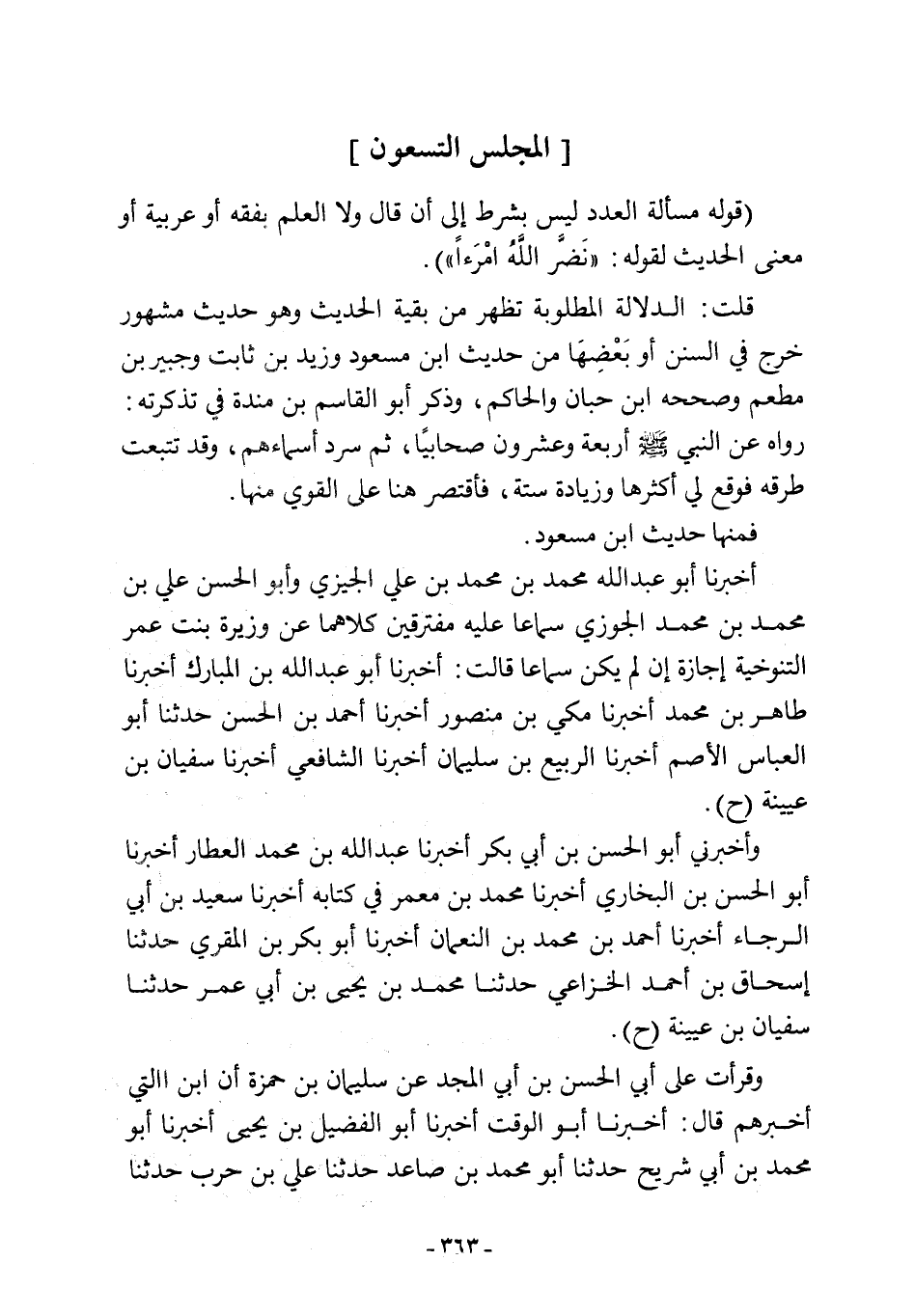 (قوله مسألة العدد ليس بشرط إلى أن قال ولا العلم بفقه أو عربية أو معنى الحديث لقوله: "نَضَّر اللَّهُ امْرَءًا").