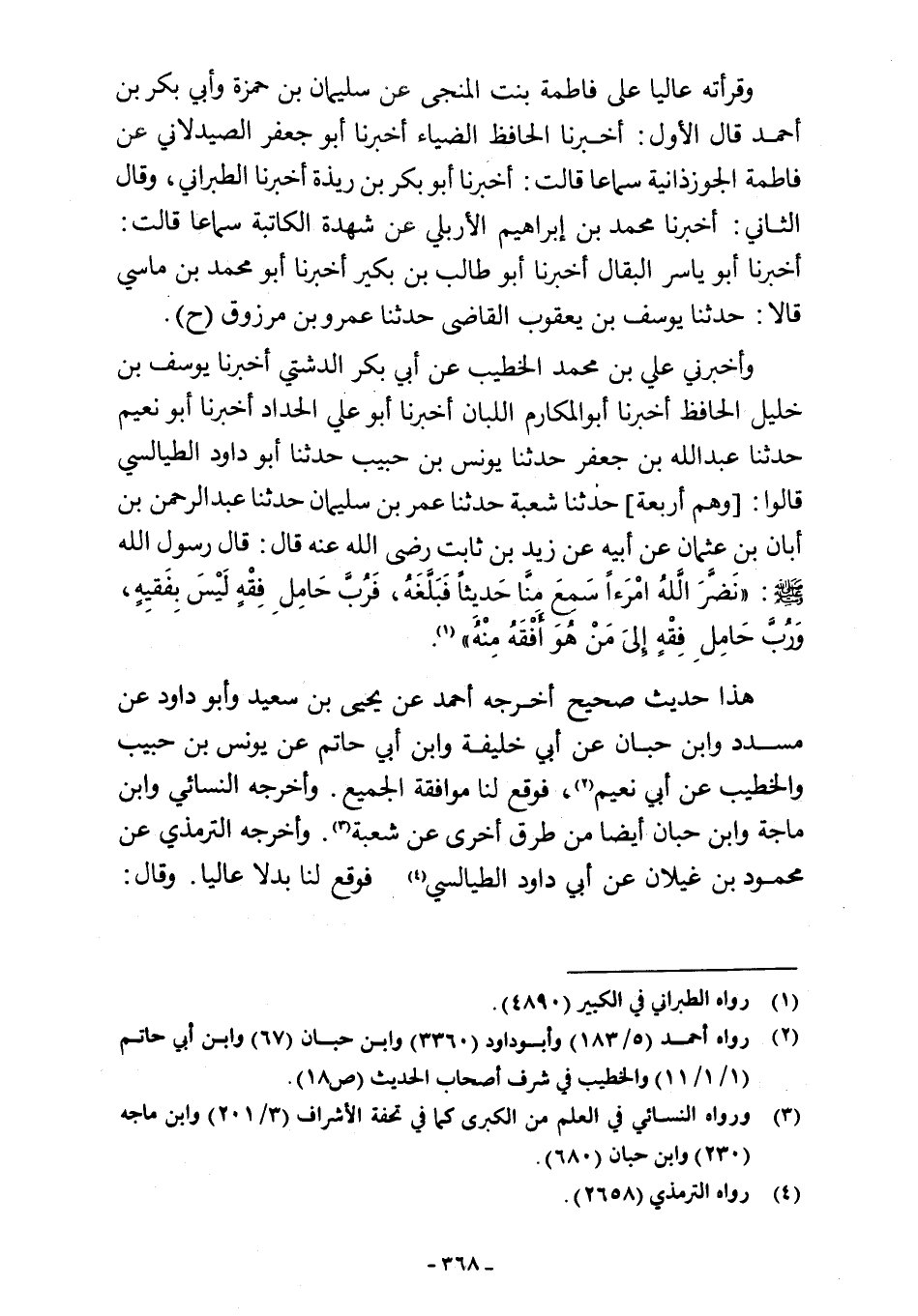 وأخبرني علي بن محمد الخطيب عن أبي بكر الدشتي أخبرنا يوسف بن خليل الحافظ أخبرنا أبو المكارم اللبان أخبرنا أبو علي الحداد أخبرنا أبو نعيم حدثنا عبد اللَّه بن جعفر حدثنا يونس بن حبيب حدثنا أبو داود الطيالسي قالوا: [وهم أربعة] حدثنا شعبة حدثنا عمر بن سليمان حدثنا عبد الرحمن بن أبان بن عثمان عن أبيه عن زيد بن ثابت رضي اللَّه عنه قال: قال رسول اللَّه -صلى اللَّه عليه وسلم-: "نَضَّرَ اللَّهُ امْرَءًا سَمِعَ مِنَّا حَديثًا فبَلَّغَهُ، فَرُبَّ حَامِلِ فِقْهٍ لَيسْ بِفَقيهٍ، وَرُبَّ حامِلِ فِقْهٍ إِلى مَنْ هُوَ أفْقَهُ مِنْهُ" (¬1).