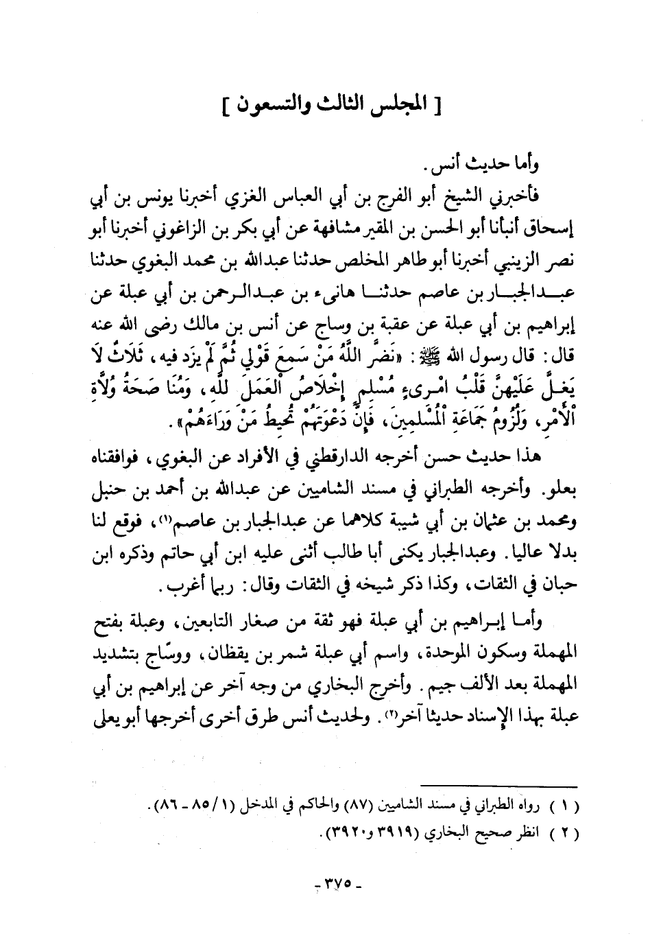 فأخبرني الشيخ أبو الفرج بن أبي العباس الغزي أخبرنا يونس بن أيى إسحاق أنبأنا أبو الحسن بن المقير مشافهة عن أبي بكر بن الزاغوني أخبرنا أبو نصر الزينبي أخبرنا أبو طاهر المخلص حدثنا عبد اللَّه بن محمد البغوي حدثنا عبد الجبار بن عاصم حدثنا هانئ بن عبد الرحمن بن أبي عبلة عن إبراهيم بن أبي عبلة عن عقبة بن وساج عن أنس بن مالك رضي اللَّه عنه قال: قال رسول اللَّه -صلى اللَّه عليه وسلم-: "نَضَّر اللَّهُ مَنْ سَمِعَ قَوْلِي ثُمَّ لَمْ يزَد فيه، ثَلَاثٌ لَا يَغلَّ عَلَيْهن قَلْبُ امْرئٍ مُسْلِم إخْلَاصُ العَمَلِ للَّهِ، وَمُنَّا صَحَةُ وُلَّاةِ الأَمْرِ، وَلُزُومُ جَمَاعَةِ المُسْلمِينَ، فَإِنَّ دَعْوَتَهُمْ تُحِيطُ مَنْ وَرَاءَهُمْ".