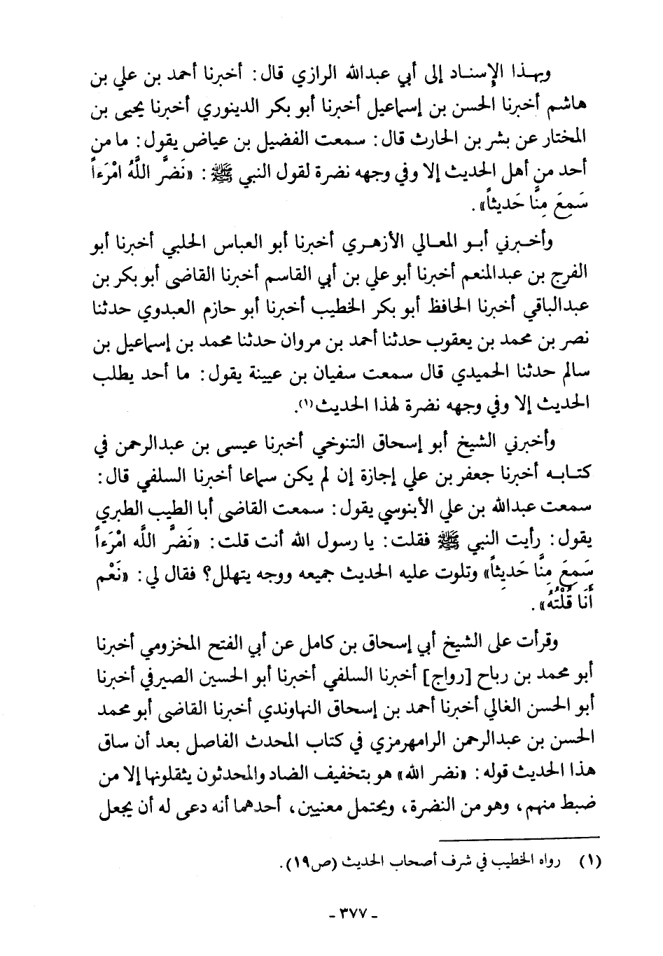 وأخبرني أبو المعالي الأزهري أخبرنا أبو العباس الحلبي أخبرنا أبو الفرج بن عبد المنعم أخبرنا أبو علي بن أبي القاسم أخبرنا القاضى أبو بكر بن عبد الباقي أخبرنا الحافظ أبو بكر الخطيب أخبرنا أبو حازم العبدوي حدثنا نصر بن محمد بن يعقوب حدثنا أحمد بن مروان حدثنا محمد بن اسماعيل بن سالم حدثنا الحميدي قال سمعت سفيان بن عيينة يقول: ما أحد يطلب الحديث إلا وفي وجهه نضرة لهذا الحديث (¬1).