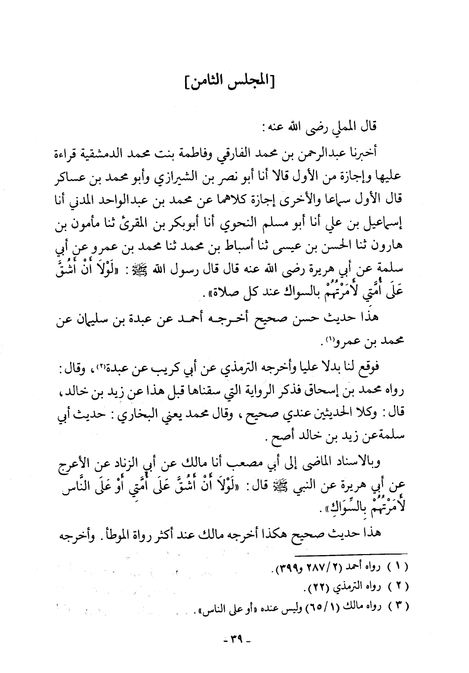 أخبرنا عبد الرحمن بن محمد الفارقي وفاطمة بنت محمد الدمشقية قراءة عليها وإجازة من الأول قالا أنا أبو نصر بن الشيرازي وأبو محمد بن عساكر قال الأول سماعا والأخرى إجازة كلاهما عن محمد بن عبد الواحد المدني أنا إسماعيل بن علي أنا أبو مسلم النحوي أنا أبو بكر بن المقرئ ثنا مأمون بن هارون ثنا الحسن بن عيسى ثنا أسباط بن محمد ثنا محمد بن عمرو وعن أبي سلمة عن أبي هريرة رضي اللَّه عنه قال قال رسول اللَّه -صلى اللَّه عليه وسلم-: "لَوْلَا أَنْ أَشُقَّ عَلَى أُمَّتي لأَمَرْتُهُمْ بالسواك عند كل صلاة".