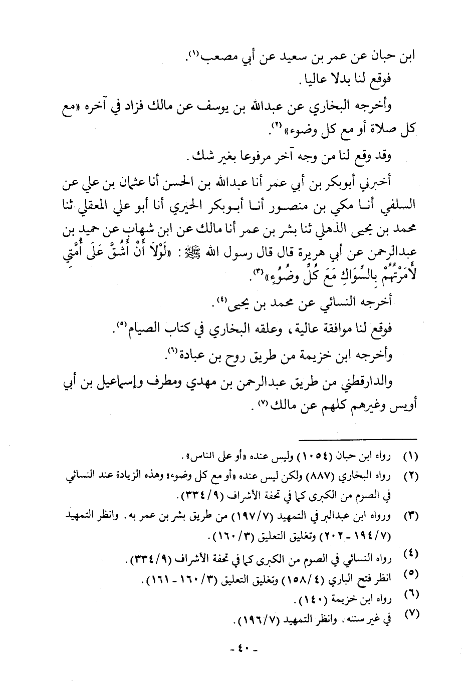 أخبرني أبو بكر بن أبي عمر أنا عبد اللَّه بن الحسن أنا عثمان بن علي عن السلفي أنا مكي بن منصور أنا أبو بكر الحيري أنا أبو علي المعقاب ثنا محمد بن يحيى الذهاب ثنا بشر بن عمر أنا مالك عن ابن شهاب عن حميد بن عبد الرحمن عن أبي هريرة قال قال رسول اللَّه -صلى اللَّه عليه وسلم-: "لَوْلَا أَنْ أَشُقَّ عَلَى أُمَّتِي لأَمَرْتُهُمْ بالسِّوَاكِ عند كُلِّ وضُوُءٍ". (¬3).