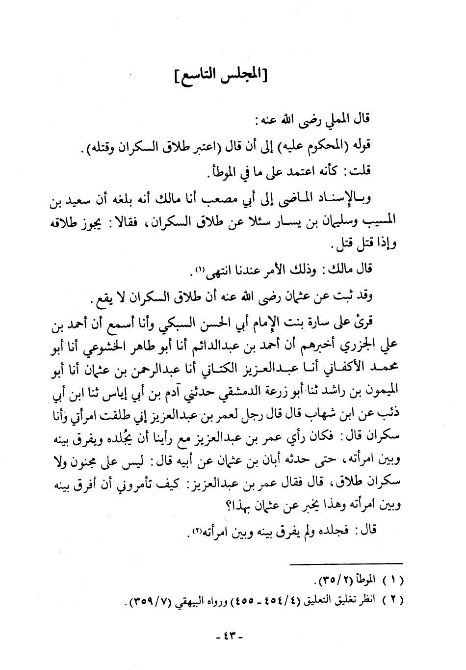 وبالإِسناد الماضى إلى أبي مصعب أنا مالك أنه بلغه أن سعيد بن المسيب وسليمان بن يسار سئلا عن طلاق السكران، فقالا: يجوز طلاقه وإذا قتل قتل.