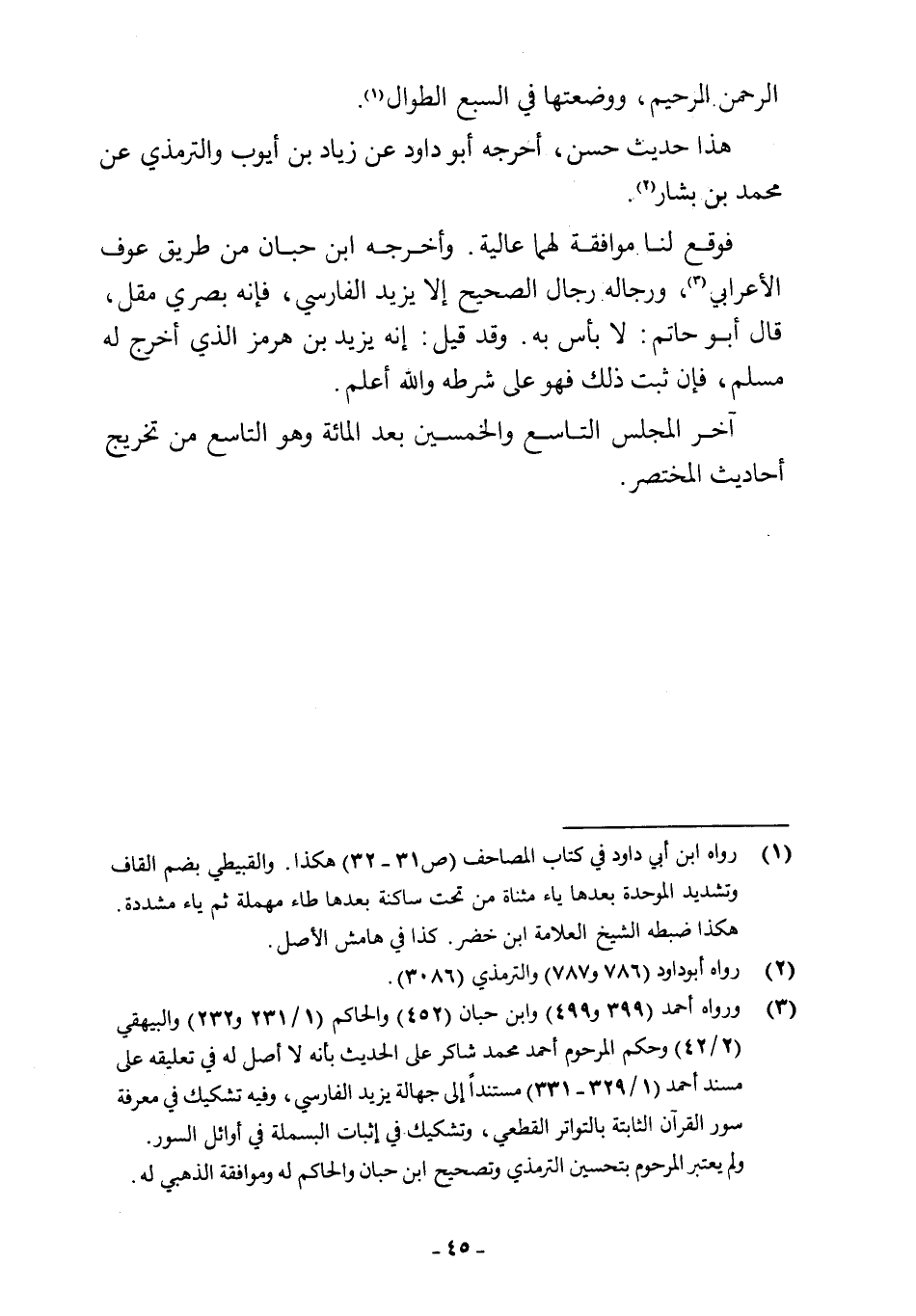(¬3) ورواه أحمد (399 و 499) وابن حبان (452) والحاكم (1/ 231 و 232) والبيهقي (2/ 42) وحكم المرحوم أحمد محمد شاكر على الحديث بأنه لا أصل له في تعليقه على مسند أحمد (1/ 329 - 331) مستندًا إلى جهالة يزيد الفارسي، وفيه تشكيك في معرفة سور القرآن الثابتة بالتواتر القفعي، وتشكيك في إثبات البسملة في أوائل السور.