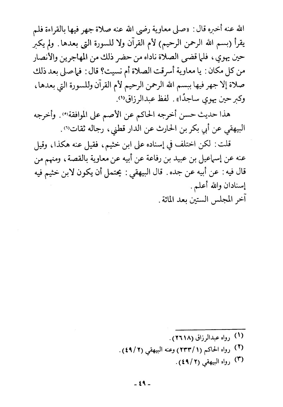 اللَّه عنه أخبره قال: "صلى معاوية رضي اللَّه عنه صلاة جهر فيها بالقراءة فلم يقرأ (بِسْمِ اللَّهِ الرَّحْمَنِ الرَّحِيمِ) لأم القرآن ولا للسورة التى بعدها. ولم يكبر حين يهوي، فلما قضى الصلاة ناداه من حضر ذلك من المهاجرين والأنصار من كل مكان: يا معاوية أسرقت الصلاة أم نسيت؟ قال: فما صلى بعد ذلك صلاة إلا جهر فيها ببِسْمِ اللَّهِ الرَّحْمَنِ الرَّحِيمِ لأم القرآن وللسورة التي بعدها، وكبر حين يهوي ساجدًا". لفظ عبد الرزاق (¬1).