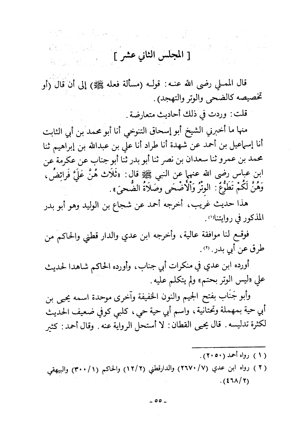 منها ما أخبرني الشيخ أبو إسحاق التنوخي أنا أبو محمد بن أبي الثابت أنا إسماعيل بن أحمد عن شهدة أنا طراد أنا علي بن عبد اللَّه بن إبراهيم ثنا محمد بن عمرو ثنا سعدان بن نصر ثنا أبو بدر ثنا أبو جناب عن عكرمة عن ابن عباس رضي اللَّه عنهما عن النبي -صلى اللَّه عليه وسلم- قال: "ثَلَاث هُنَّ عَلَيَّ فَرائِضُ، وَهُنَّ لَكُمْ تَطَوُّعٌ: الوِتْرُ وَالأَضْحَى وصَلَاةُ الضُّحَى".