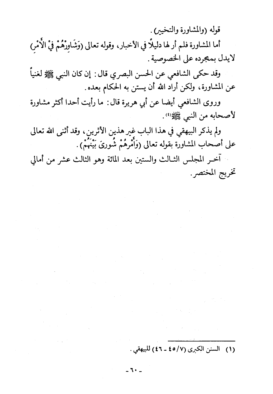 ولم يذكر البيهقي في هذا الباب غير هذين الأثرين، وقد أثنى اللَّه تعالى على أصحاب المشاورة بقوله تعالى {وَأَمْرُهُمْ شُورَى بَيْنَهُمْ}.