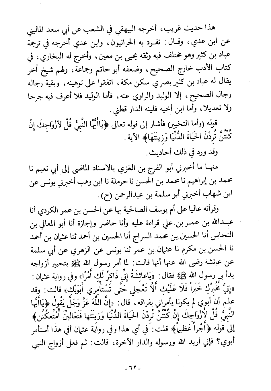 وقرأته عاليا على أم يوسف الصالحية بها عن الحسن بن عمر الكردي أنا عبد اللَّه بن عمر بن علي قراءة عليه وأنا حاضر وإجازة أنا أبو المعالي بن النحاس أنا الحسين بن محمد السراج أنا الحسين بن أحمد ثنا عثمان بن أحمد نا الحسن بن مكرم نا عثمان بن عمر ثنا يونس عن الزهري عن أبي سلمة عن عائشة رضي اللَّه عنها أنها قالت: لما أمر رسول اللَّه -صلى اللَّه عليه وسلم- بتخيير أزواجه بدأ بي رسول اللَّه -صلى اللَّه عليه وسلم- فقال: "يَا عائِشَةُ إِنِّي ذَاكِرُ لَكِ أَمْرًا" وفي رواية عثمان: "إِنِّي مُخُبِرُكِ خَبَرًا فَلَا عَلَيْكِ أَلَّا تَعْجلي حَتَّى تَسْتَأْمِري أَبَوَيْكِ" قالت: وقد علم أن أبوي لم يكونا يأمراني بفراقه، قال: "إِنَّ اللَّهَ عَزَّ وَجَلَّ يَقُولُ {يَاأَيُّهَا النَّبِيُّ قُلْ لِأَزْوَاجِكَ إِنْ كُنْتُنَّ تُرِدْنَ الْحَيَاةَ الدُّنْيَا وَزِينَتَهَا فَتَعَالَيْنَ أُمَتِّعْكُنَّ} إلى قوله {أَجْرًا عَظِيمًا} قلت: في أي هذا وفي رواية عثمان أفي هذا أستأمر أبوي؟ فإني أريد اللَّه ورسوله والدار الآخرة، قالت: ثم فعل أزواج النبي
