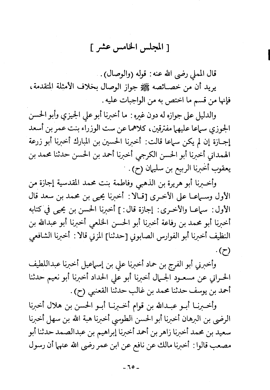 والدليل على جوازه له دون غيره: ما أخبرنا أبو علي الجيزي وأبو الحسن الجوزي سماعا عليهما مفترقين، كلاهما عن ست الوزراء بنت عمر بن أسعد إجازة إن لم يكن سماعا قالت: أخبرنا الحسين بن المبارك أخبرنا أبو زرعة الهمداني أخبرنا أبو الحسن الكرجي أخبرنا أحمد بن الحسن حدثنا محمد بن يعقوب أخبرنا الربيع بن سليمان (ح).