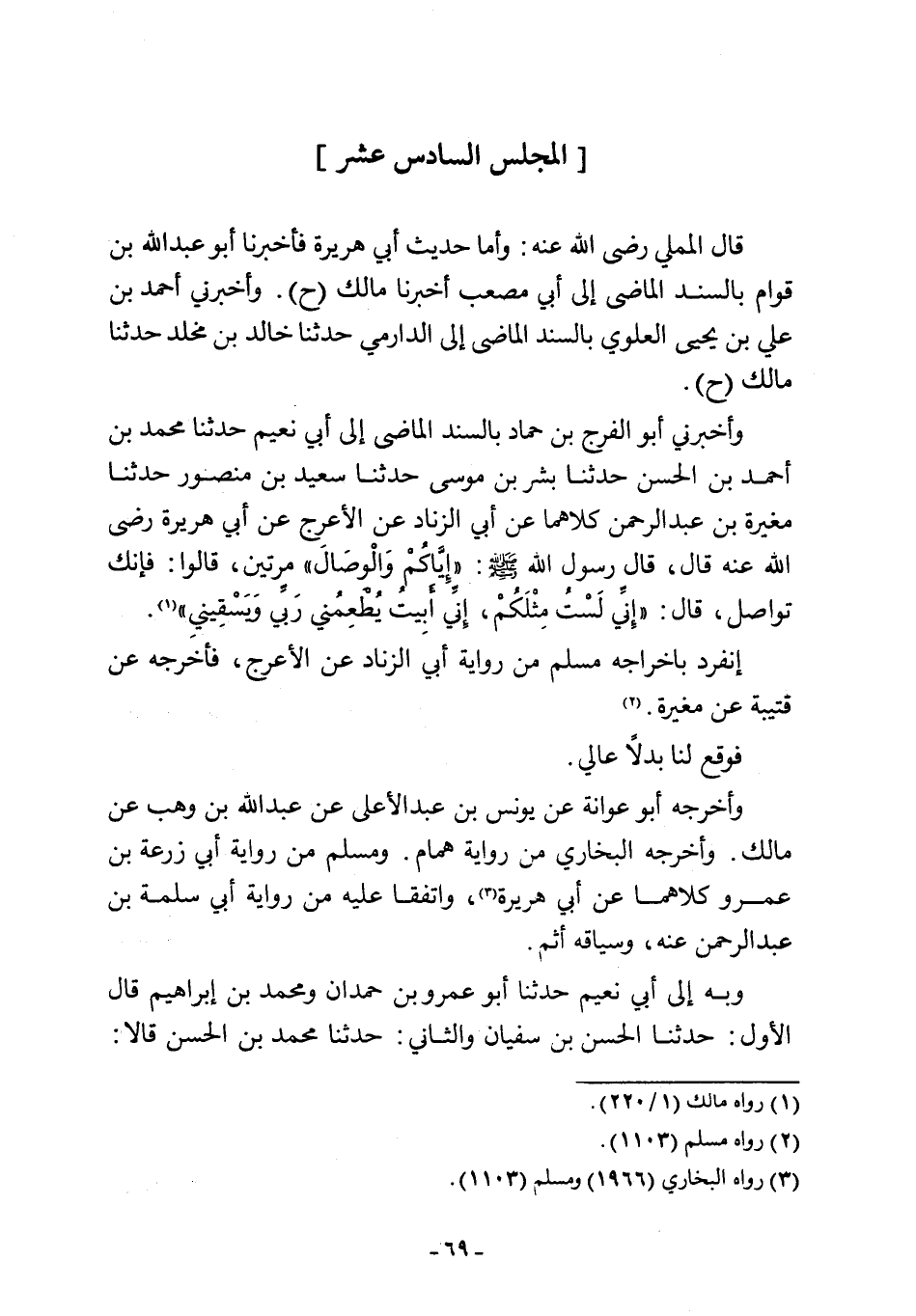 قال المملي رضي اللَّه عنه: وأما حديث أبي هريرة فأخبرنا أبو عبد اللَّه بن قوام بالسند الماضى إلى أبي مصعب أخبرنا مالك (ح). وأخبرني أحمد بن علي بن يحيى العلوي بالسند الماضى إلى الدارمي حدثنا خالد بن مخلد حدثنا مالك (ح).