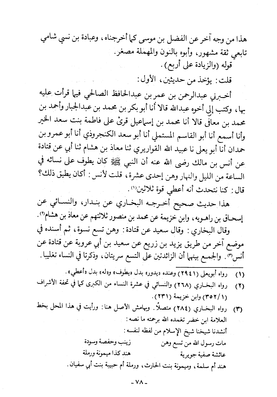 أخبرني عبد الرحمن بن عمر بن عبد الحافظ الصالحي فيما قرأت عليه بها، وكتب إلى أخوه عبد اللَّه قالا أنا أبو بكر بن محمد بن عبد الجبار وأحمد بن محمد بن معافى قالا أنا محمد بن إسماعيل قرئ على فاطمة بنت سعد الخير وأنا أسمع أنا أبو القاسم المستملي أنا أبو سعد الكنجروذي أنا أبو عمرو بن حمدان أنا أبو يعلى نا عبيد اللَّه القواريري ثنا معاذ بن هشام ثنا أبي عن قتادة عن أنس بن مالك رضي اللَّه عنه أن النبي -صلى اللَّه عليه وسلم- كان يطوف على نسائه في الساعة من الليل والنهار وهن إحدى عشرة، قلت لأنس: أكان يطيق ذلك؟ قال: كنا نتحدث أنه أعطي قوة ثلاثين (¬1).