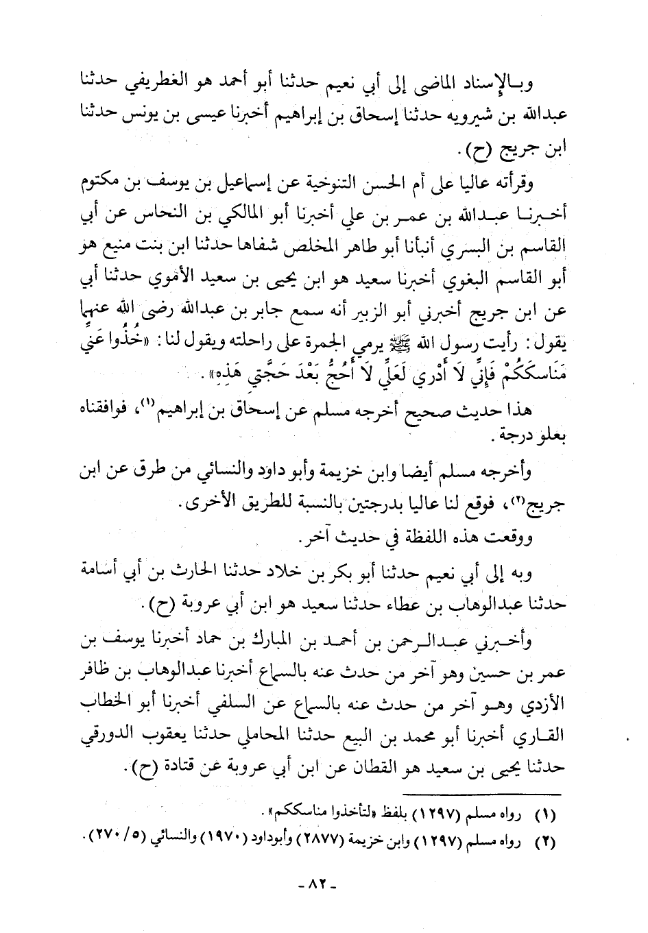 وقرأته عاليا على أم الحسن التنوخية عن إسماعيل بن يوسف بن مكتوم أخبرنا عبد اللَّه بن عمر بن علي أخبرنا أبو المالكي بن النحاس عن أبي القاسم بن البسري أنبأنا أبو طاهر المخلص شفاها حدثنا ابن بنت منيع هو أبو القاسم البغوي أخبرنا سعيد هو ابن يحيى بن سعيد الأموي حدثنا أبي عن ابن جريج أخبرني أبو الزبير أنه سمع جابر بن عبد اللَّه رضي اللَّه عنهما يقول: رأيت رسول اللَّه -صلى اللَّه عليه وسلم- يرمي الجمرة على راحلته ويقول لنا: "خُذُوا عَنِّي مَنَاسكَكُمْ فَإِنِّي لَا أَدْري لَعَلِّي لَا أَحُجُّ بَعْدَ حَجَّتِي هَذِهِ".