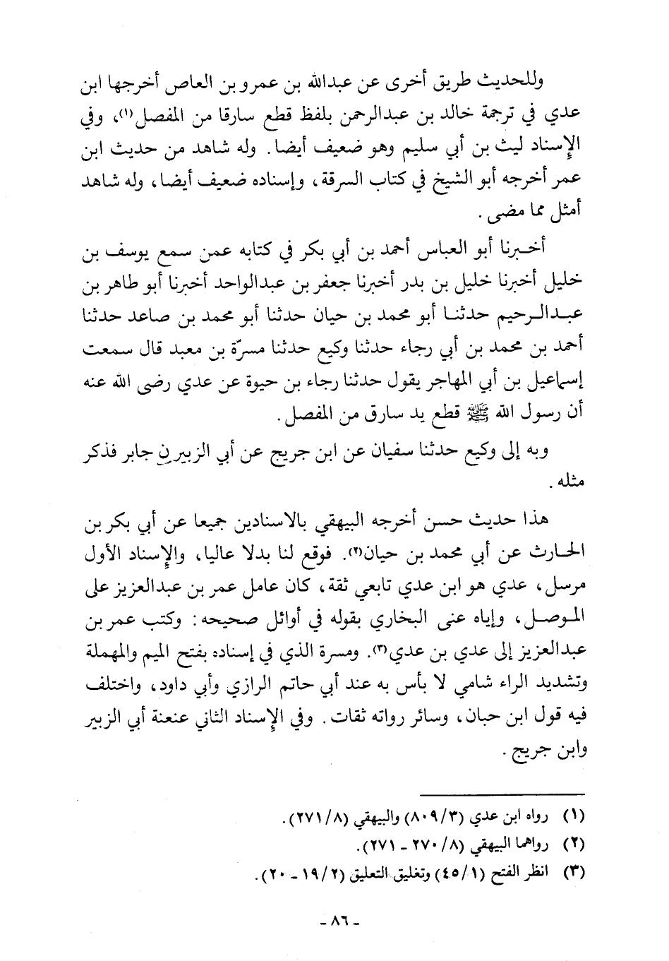 وللحديث طريق أخرى عن عبد اللَّه بن عمرو بن العاص أخرجها ابن عدي في ترجمة خالد بن عبد الرحمن بلفظ قطع سارقا من المفصل (¬1)، وفي الإسناد ليث بن أبي سليم وهو ضعيف أيضًا. وله شاهد من حديث ابن عمر أخرجه أبو الشيخ في كتاب السرقة، وإسناده ضعيف أيضًا، وله شاهد أمثل مما مضى.
