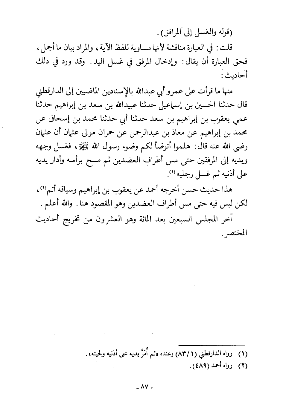 منها ما قرأت على عمرو أبي عبد اللَّه بالإسنادين الماضيين إلى الدارقطني قال حدثنا الحسين بن إسماعيل حدثنا عبيد اللَّه بن سعد بن إبراهيم حدثنا عمي يعقوب بن إبراهيم بن سعد حدثنا أبي حدثنا محمد بن إسحاق عن محمد بن إبراهيم عن معاذ بن عبد الرحمن عن حمران مولى عثمان أن عثمان رضي اللَّه عنه قال: هلموا أتوضأ لكم وضوء رسول اللَّه -صلى اللَّه عليه وسلم-، فغسل وجهه ويديه إلى المرفقين حتى مس أطراف العضدين ثم مسح برأسه وأدار يديه على أذنيه ثم غسل رجليه (¬1).