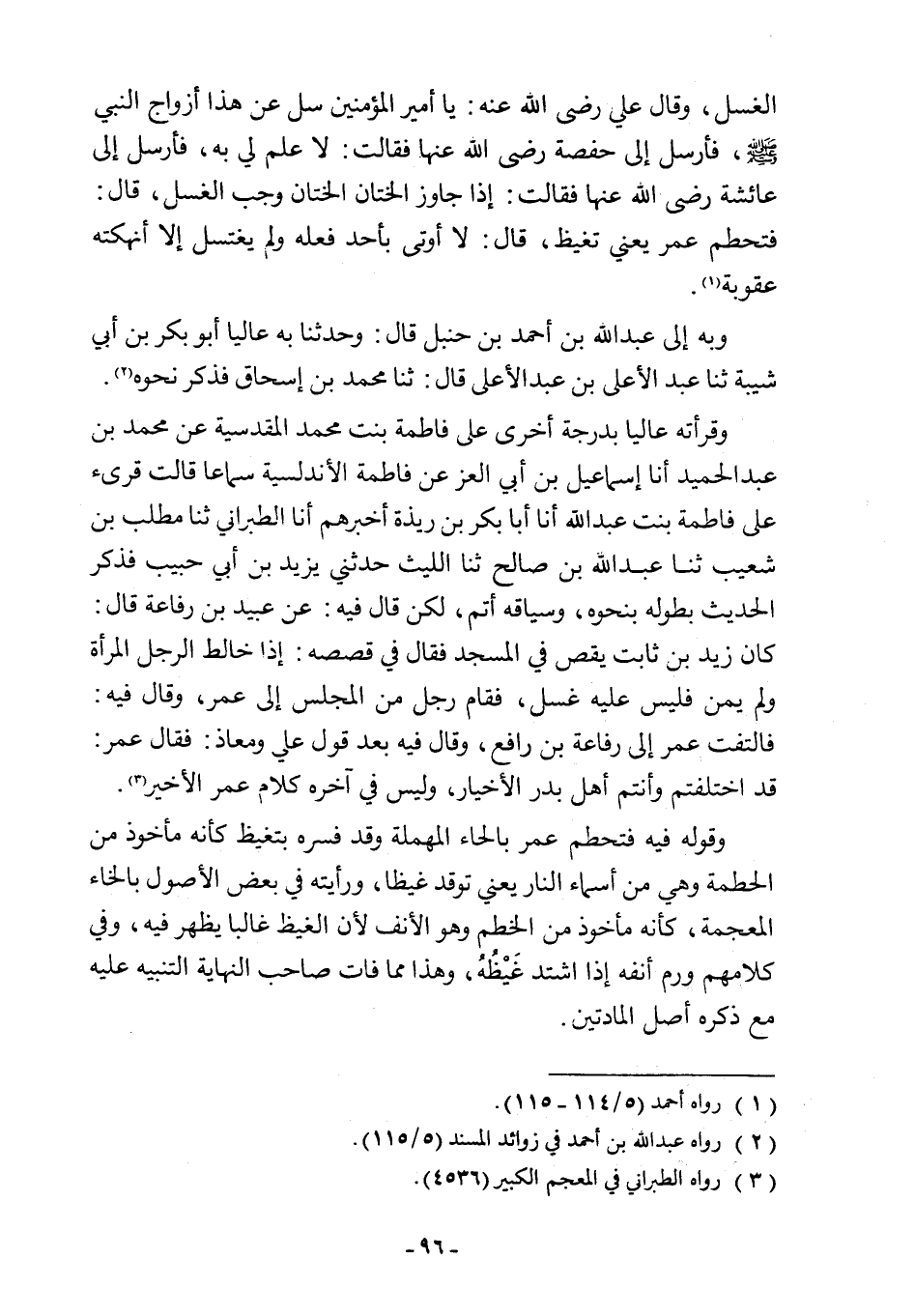 الغسل، وقال علي رضي اللَّه عنه: يا أمير المؤمنين سل عن هذا أزواج النبي -صلى اللَّه عليه وسلم-، فأرسل إلى حفصة رضي اللَّه عنها فقالت: لا علم لي به، فأرسل إلى عائشة رضي اللَّه عنها فقالت: إذا جاوز الختان الختان وجب الغسل، قال: فتحطم عمر يعني تغيظ، قال: لا أوتى بأحد فعله ولم يغتسل إلا أنهكته عقوبة (¬1).