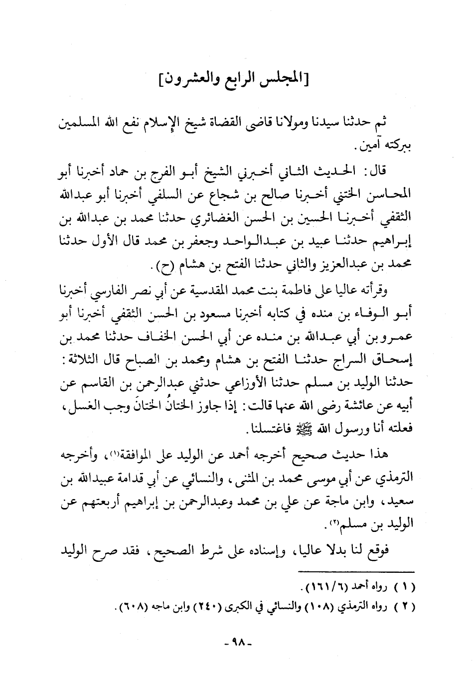 وقرأته عاليا على فاطمة بنت محمد المقدسية عن أبي نصر الفارسي أخبرنا أبو الوفاء بن منده في كتابه أخبرنا مسعود بن الحسن الثقفي أخبرنا أبو عمرو بن أبي عبد اللَّه بن منده عن أبي الحسن الخفاف حدثنا محمد بن إسحاق السراج حدثنا الفتح بن هشام ومحمد بن الصباح قال الثلاثة: حدثنا الوليد بن مسلم حدثنا الأوزاعي حدثني عبد الرحمن بن القاسم عن أبيه عن عائشة رضي اللَّه عنها قالت: إذا جاوز الختانُ الختانَ وجب الغسل، فعلته أنا ورسول اللَّه -صلى اللَّه عليه وسلم- فاغتسلنا.