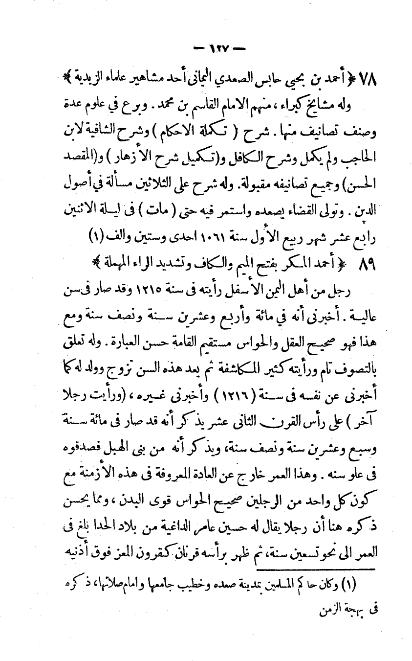 رجل من أهل الْيمن الْأَسْفَل رَأَيْته في سنة 1215 وَقد صَار في سن عالية أخبرني أَنه فِي مائَة وَأَرْبع وَعشْرين سنة وَنصف سنة وَمَعَ هَذَا فَهُوَ صَحِيح الْعقل والحواس مُسْتَقِيم الْقَامَة حسن الْعبارَة وَله تعلق بالتصوف تَامّ ورأيته كثير المكاشفة ثمَّ بعد هَذِه السن تزوج وَولد لَهُ كَمَا أخبرني عَن نَفسه في سنة 1216 وأخبرني غَيره وَرَأَيْت رجلاً آخر على رَأس الْقرن الثاني عشر يذكر أَنه قد صَار في مائَة سنة وَسبع وَعشْرين سنة وَنصف سنة وَيذكر أَنه من بني الهبل فصدقوه في علو سنه وَهَذَا الْعُمر خَارج عَن الْعَادة الْمَعْرُوفَة في هَذِه الأزمنة مَعَ كَون كل وَاحِد من الرجلَيْن صَحِيح الْحَواس قوي الْبدن وَمِمَّا يحسن ذكره هُنَا أَن رجلاً يُقَال لَهُ حُسَيْن عَامر الداغية من بِلَاد الحدا بلغ في الْعُمر إلى نَحْو تسعين سنة ثمَّ ظهر بِرَأْسِهِ قرنان كقرون الْمعز فَوق أُذُنَيْهِ