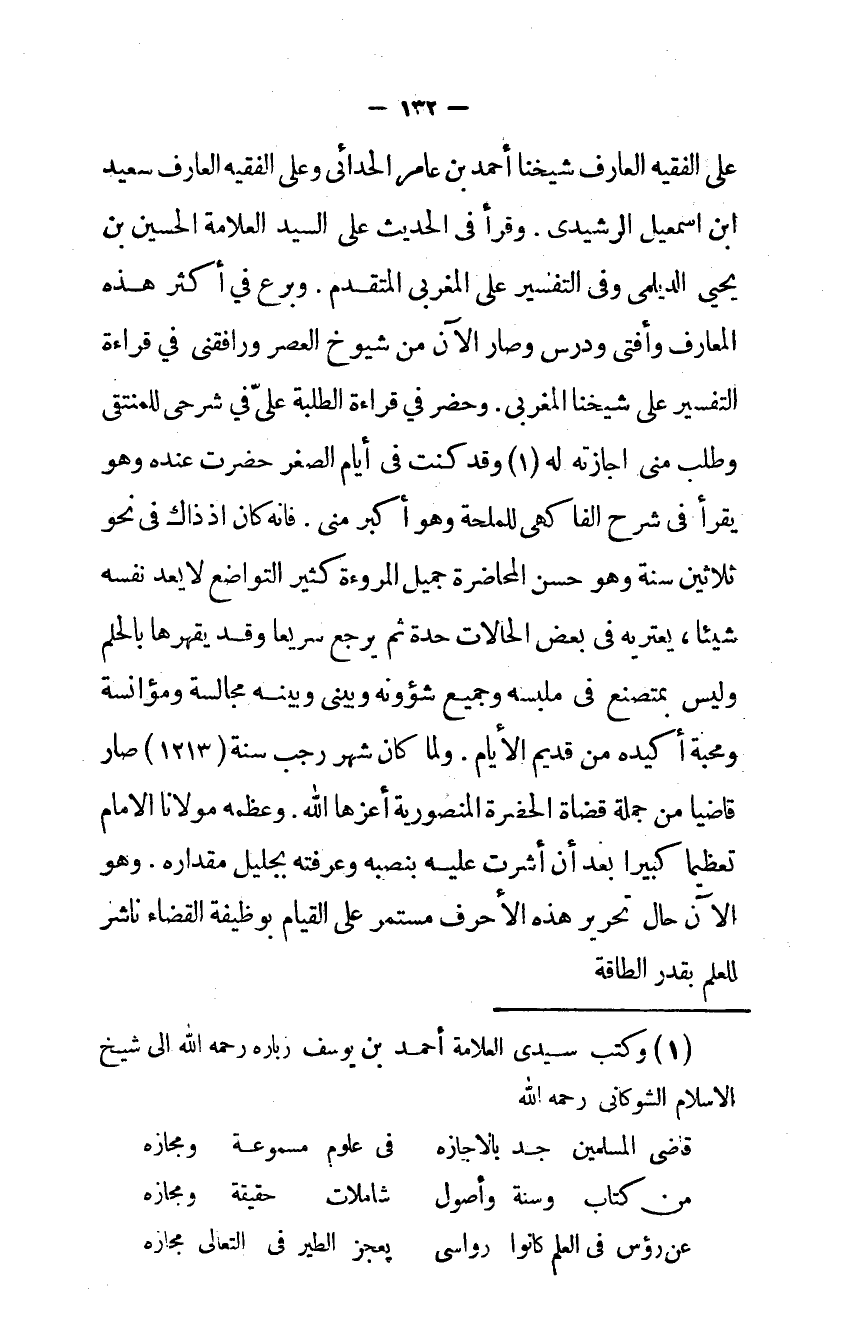 على الْفَقِيه الْعَارِف شَيخنَا أَحْمد بن عَامر الحدائى وعَلى الْفَقِيه الْعَارِف سعيد ابْن اسمعيل الرشيدي وَقَرَأَ في الحَدِيث على السَّيِّد الْعَلامَة الْحُسَيْن بن يحيى الديلمي وفي التَّفْسِير على المغربي الْمُتَقَدّم وبرع فِي أكثر هَذِه المعارف وَأفْتى ودرّس وَصَارَ الآن من شُيُوخ الْعَصْر ورافقني فِي قِرَاءَة التَّفْسِير على شَيخنَا المغربي وَحضر فِي قِرَاءَة الطّلبَة عليّ فِي شرحي للمنتقى وَطلب مني إجازته لَهُ وَقد كنت في أَيَّام الصغر حضرت عِنْده وَهُوَ يقْرَأ في شرح الفاكهي للملحة وَهُوَ أكبر مني فإنه كَانَ اذ ذَاك في نَحْو ثَلَاثِينَ سنة وَهُوَ حسن المحاضرة جميل الْمُرُوءَة كثير التَّوَاضُع لَا يعد نَفسه شَيْئا يَعْتَرِيه في بعض الْحَالَات حِدة ثمَّ يرجع سَرِيعا وَقد يقهرها بالحلم وَلَيْسَ بمتصنع في ملبسه وَجَمِيع شؤونه وبيني وَبَينه مجالسة ومؤانسة ومحبة أكيدة من قديم الْأَيَّام وَلما كَانَ شهر رَجَب سنة 1213 صَار قَاضِيا من جملَة قُضَاة الحضرة المنصورية أعزها الله وعظّمه مَوْلَانَا الإمام تَعْظِيمًا كَبِيرا بعد أَن أشرت عَلَيْهِ بنصبه وعرفته بجليل مِقْدَاره وَهُوَ الآن حَال تَحْرِير هَذِه الأحرف مُسْتَمر على الْقيام بوظيفة الْقَضَاء ناشر للْعلم بِقدر الطَّاقَة