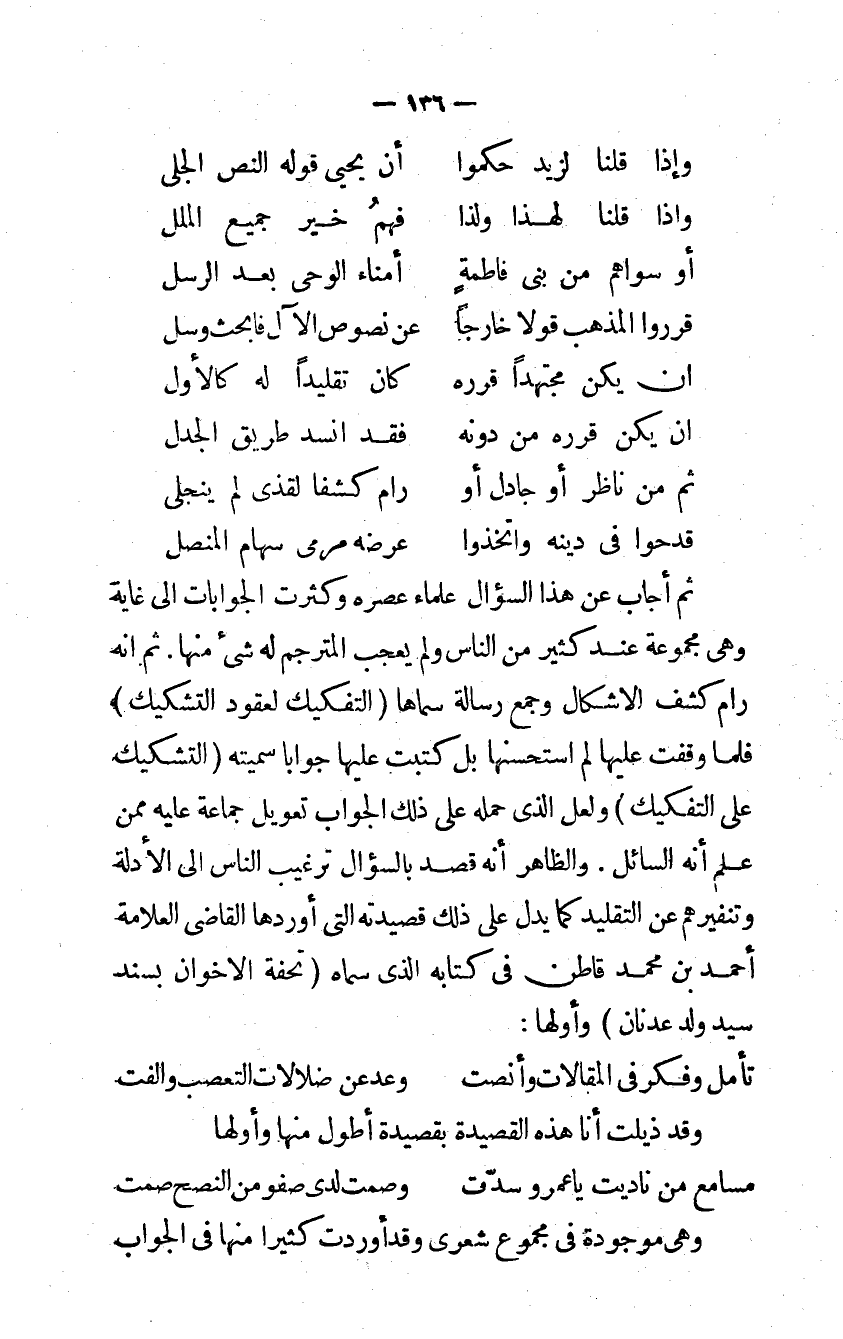ثمَّ أجَاب عَن هَذَا السُّؤَال عُلَمَاء عصره وَكَثُرت الجوابات الى غَايَة وهى مَجْمُوعَة عِنْد كثير من النَّاس وَلم يعجب المترجم لَهُ شئ مِنْهَا ثمَّ أنه رام كشف الإشكال وَجمع رِسَالَة سَمَّاهَا التفكيك لعقود التشكيك فَلَمَّا وقفت عَلَيْهَا لم أستحسنها بل كتبت عَلَيْهَا جَوَابا سميته التشكيك على التفكيك وَلَعَلَّ الَّذِي حمله على ذَلِك الْجَواب تعويل جمَاعَة عَلَيْهِ مِمَّن علم أَنه السَّائِل وَالظَّاهِر أَنه قصد بالسؤال ترغيب النَّاس إلى الْأَدِلَّة وتنفيرهم عَن التَّقْلِيد كَمَا يدل على ذَلِك قصيدته الَّتِى أوردهَا القاضي الْعَلامَة أَحْمد بن مُحَمَّد قاطن في كِتَابه الَّذِي سَمَّاهُ تحفة الأخوان بِسَنَد سيد ولد عدنان وأولها