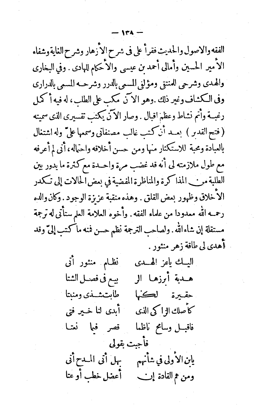 الْفِقْه والأصول والْحَدِيث فَقَرَأَ عليّ في شرح الأزهار وَشرح الْغَايَة وشفاء الْأَمِير الْحُسَيْن وأمالي أَحْمد بن عِيسَى وَالْأَحْكَام للهادي وَفِي البخاري وَالْهدى وشرحى للمنتقى ومؤلفي الْمُسَمّى بالدرر وَشَرحه الْمُسَمّى بالدراري وفي الْكَشَّاف وَغير ذَلِك وَهُوَ الآن مكبّ على الطلب لَهُ فِيهِ أكمل رَغْبَة وَأتم نشاط وَعظم إقبال وَصَارَ الآن يكْتب تفسيري الَّذِي سميته فتح الْقَدِير بعد أَن كتب غَالب مصنفاتي وسمعها عليّ وَله اشْتِغَال بِالْعبَادَة ومحبة للاستكثار مِنْهَا وَمن حسن أخلاقه واحتماله أَنى لم أعرفهُ مَعَ طول ملازمته لي أَنه قد غضب مرة وَاحِدَة مَعَ كَثْرَة مَا يَدُور بَين الطّلبَة من المذاكرة والمناظرة المفضية فِي بعض الْحَالَات إِلَى تكدر الْأَخْلَاق وَظُهُور بعض القلق وَهَذِه منقبة عزيزة الْوُجُود وَكَانَ وَالِده رَحمَه الله معدوداً من عُلَمَاء الْفِقْه وَأَخُوهُ الْعَلامَة الْعلم ستأتي لَهُ تَرْجَمَة مُسْتَقلَّة إِن شَاءَ الله وَلِصَاحِب التَّرْجَمَة نظم حسن فَمِنْهُ مَا كتب إِلَى وَقد أهْدى لي طَاقَة زهر منثور