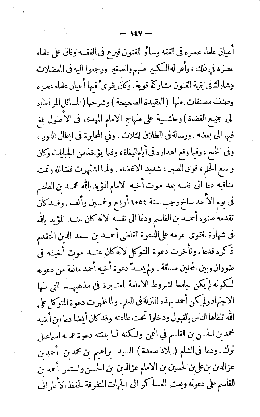 أَعْيَان عُلَمَاء عصره فِي الْفِقْه وَسَائِر الْفُنُون فبرع فِي الْفِقْه وفَاق على عُلَمَاء عصره فِي ذَلِك وَأقر لَهُ الْكثير مِنْهُم وَالصَّغِير وَرَجَعُوا إِلَيْهِ فِي المعضلات وشارك فِي بَقِيَّة الْفُنُون مُشَاركَة قَوِيَّة وَكَانَ يقرئ فِيهَا أَعْيَان عُلَمَاء عصره وصنّف مصنّفات مِنْهَا العقيدة الصَّحِيحَة وَشَرحهَا الْمسَائِل المرتضاة إِلَى جَمِيع الْقُضَاة وحاشية على منهاج الإمام المهدي في الْأُصُول بلغ فِيهَا إلى بعضه ورسالة في الطَّلَاق للثلاث وَفِي المحايرة في إبطال الدور وَفِي الْخلْع وَفِيمَا وَقع إهداره في أَيَّام الْبُغَاة وَفِيمَا يُؤْخَذ من الجبايات وَكَانَ وَاسع الْحلم قوي الصَّبْر شَدِيد الإغضاء وَلما اشتهرت فضائله وتمت مناقبه دَعَا إلى نَفسه بعد موت أخيه الإمام الْمُؤَيد بِاللَّه مُحَمَّد بن الْقَاسِم فى يَوْم الْأَحَد سلخ رَجَب سنة 1054 أَربع وَخمسين وَألف وَقد كَانَ تقدمه صنوه أَحْمد بن الْقَاسِم ودعا إلى نَفسه لأنه كَانَ عِنْد الْمُؤَيد بِاللَّه في شهارة فقوى عزمه على الدعْوَة القاضي أَحْمد بن سعد الدَّين الْمُتَقَدّم ذكره فَدَعَا وتأخرت دَعْوَة المتَوَكل لأنه كَانَ عِنْد موت أَخِيه فى صوران وَبَين المحلين مَسَافَة وَلم يعد دَعْوَة أَخِيه أَحْمد مَانِعَة من دَعوته لكَونه لم يكن جَامعا لشروط الإمامة الْمُعْتَبرَة فِي مَذْهَبهمَا الَّتِى مِنْهَا الِاجْتِهَاد وَلم يكن أَحْمد بِهَذِهِ الْمنزلَة في الْعلم وَلما ظَهرت دَعْوَة المتَوَكل على الله تلقاها النَّاس بِالْقبُولِ ودخلوا تَحت طَاعَته وَقد كَانَ أَيْضا دَعَا ابْن أَخِيه مُحَمَّد بن الْحسن بن الْقَاسِم فِي الْيمن وَلكنه لما بلغته دَعْوَة عَمه إسماعيل ترك ودعا في الشَّام بِلَاد صعدة السَّيِّد إبراهيم بن مُحَمَّد بن أَحْمد بن عز الدَّين بن على بن الْحُسَيْن بن الإمام عز الدَّين بن الْحسن وَاسْتمرّ أَحْمد بن الْقَاسِم على دَعوته وَبعث العساكر إلى الْجِهَات المتفرقة لحفظ الْأَطْرَاف