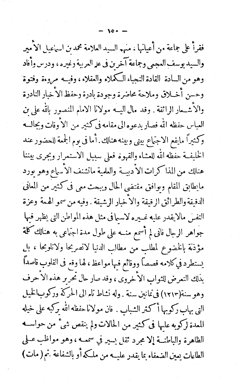 فَقَرَأَ على جمَاعَة من أعيانها مِنْهُم السَّيِّد الْعَلامَة مُحَمَّد بن إسماعيل الْأَمِير وَالسَّيِّد يُوسُف العجمي وَجَمَاعَة آخرين في علم الْعَرَبيَّة وَغَيره ودرس وَأفَاد وَهُوَ من السَّادة القادة النجباء الكملاء والعقلاء وَفِيه مُرُوءَة وفتوة وَحسن أَخْلَاق وملاحة محاضرة وجودة بادرة وَحفظ الْأَخْبَار النادرة والأشعار الرائقة وَقد مَال إليه مَوْلَانَا الإمام الْمَنْصُور بِاللَّه علي بن الْعَبَّاس حفظه الله فَصَارَ يَدعُوهُ إلى مقَامه في كثير من الْأَوْقَات ويجالسه وَكَثِيرًا مَا يَقع الِاجْتِمَاع بيني وَبَينه هُنَالك أما في يَوْم الْجُمُعَة للحضور عِنْد الْخَلِيفَة حفظه الله للعشاء والقهوة فعلى سَبِيل الِاسْتِمْرَار ويجري بَيْننَا هُنَالك من المذاكرات الأدبية والعلمية مَا تشنف الأسماع وَهُوَ يُورد مَا يُطَابق الْمقَام ويوافق مُقْتَضى الْحَال ويبحث معي في كثير من الْمعَانى الدقيقة والطرائق الرقيقة وَالْأَخْبَار الرشيقة وَفِيه من سمو الهمة عزة النَّفس مَا لَا يقدر عَلَيْهِ غَيره لاسيما في مثل هَذِه المواطن الَّتِى يظْهر فِيهَا جَوَاهِر الرِّجَال فإني لم أسمع مِنْهُ على طول مُدَّة اجتماعي بِهِ هُنَالك كلمة مؤذنة بالخضوع لمطلب من مطَالب الدُّنْيَا الدُّنْيَا لَا تَصْرِيحًا وَلَا تَلْوِيحًا بل يستطرد فِي كَلَامه قصصاً ووقائع فِيهَا مواعظ لَهَا وَقع في الْقُلُوب قَاصِدا بذلك التَّعَرُّض للثَّواب الأخروي وَقد صَار حَال تَحْرِير هَذِه الأحرف وَهُوَ سنة 1213 في ثَمَانِينَ سنة وَله نشاط تَامّ إلى الْحَرَكَة وركوب الْخَيل الَّتِى يهاب ركُوبهَا أَكثر الشَّبَاب فإن مَوْلَانَا حفظه الله يركبه على خيله الْمعدة لركوبه عَلَيْهَا في كثير من الْحَالَات وَلم ينقص شئ من حواسه الظَّاهِرَة والباطنة إِلَّا مُجَرّد ثقل يسير فِي سَمعه وَهُوَ مواظب على الطَّاعَات يعين الضُّعَفَاء بِمَا يقدر عَلَيْهِ من ملكه أَو بالشفاعة ثمَّ مَاتَ