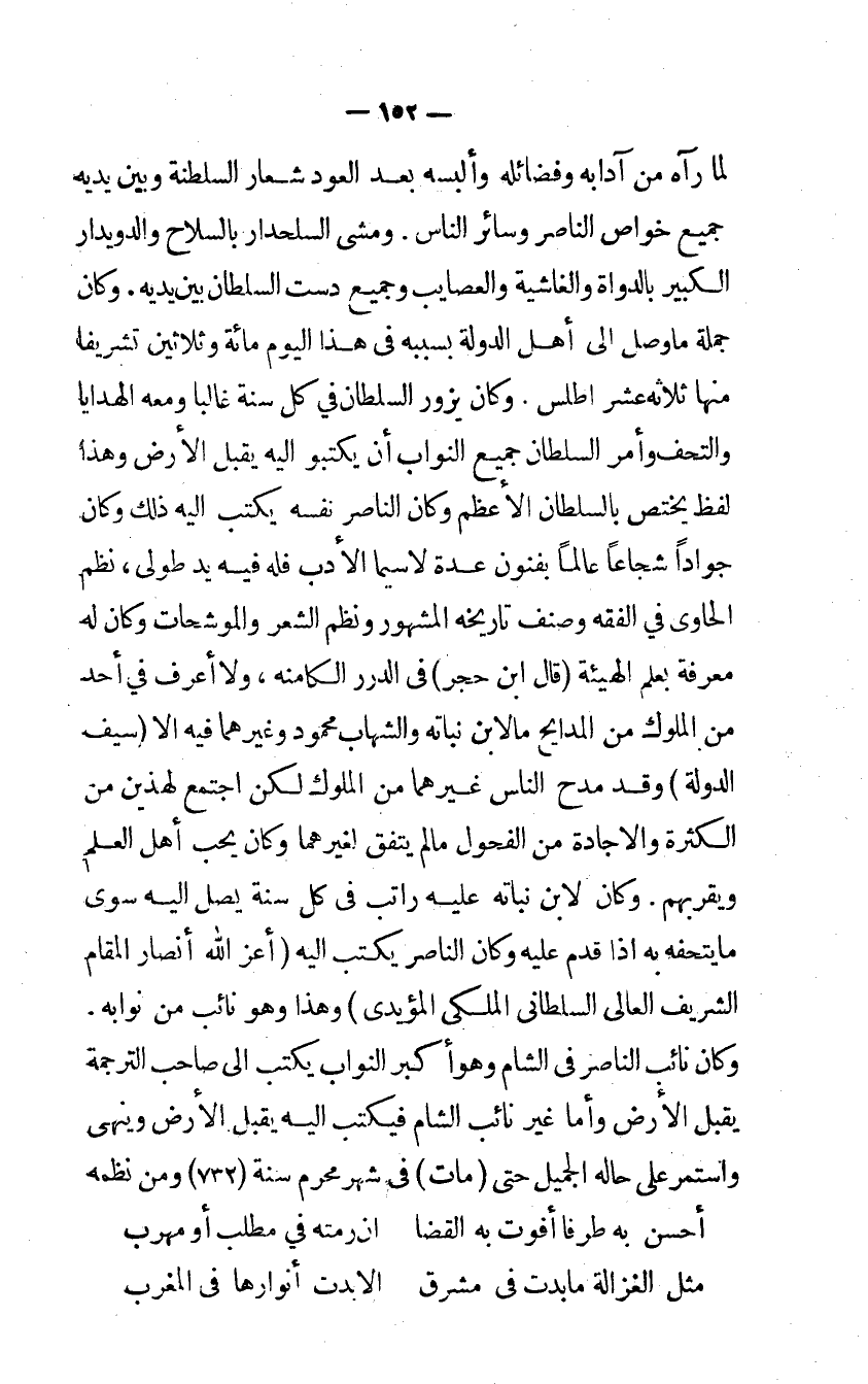 لما رَآهُ من آدابه وفضائله وَألبسهُ بعد الْعود شعار السلطنة وَبَين يَدَيْهِ جَمِيع خَواص النَّاصِر وَسَائِر النَّاس وَمَشى السلحدار بِالسِّلَاحِ والدويدار الْكَبِير بالدواة والغاشية والعصايب وَجَمِيع دست السُّلْطَان بَين يَدَيْهِ وَكَانَ جملَة مَا وصل إلى أهل الدولة بِسَبَبِهِ في هَذَا الْيَوْم مائَة وَثَلَاثِينَ تَشْرِيفًا مِنْهَا ثلَاثه عشر أطلس وَكَانَ يزور السُّلْطَان فِي كل سنة غَالِبا وَمَعَهُ الْهَدَايَا والتحف وَأمر السُّلْطَان جَمِيع النواب أَن يكتبو اليه يقبل الأَرْض وَهَذَا لفظ يخْتَص بالسلطان الْأَعْظَم وَكَانَ النَّاصِر نَفسه يكْتب إليه ذَلِك وَكَانَ جواداً شجاعاً عَالما بفنون عدَّة لاسيما الْأَدَب فَلهُ فِيهِ يَد طولى نظم الحاوي فِي الْفِقْه وصنف تَارِيخه الْمَشْهُور ونظم الشّعْر والموشحات وَكَانَ لَهُ معرفَة بِعلم الْهَيْئَة قَالَ ابْن حجر في الدُّرَر الكامنة وَلَا أعرف فِي اُحْدُ من الْمُلُوك من المدايح مالابن نَبَاته والشهاب مَحْمُود وَغَيرهمَا فِيهِ إلا سيف الدولة وَقد مدح النَّاس غَيرهمَا من الْمُلُوك لَكِن اجتمع لهذين من الْكَثْرَة والإجادة من الفحول مالم يتَّفق لغَيْرِهِمَا وَكَانَ يحب أهل الْعلم ويقربهم وَكَانَ لِابْنِ نَبَاته عَلَيْهِ راتب في كل سنة يصل إليه سوى مَا يتحفه بِهِ إذا قدم عَلَيْهِ وَكَانَ النَّاصِر يكْتب إليه اعز الله أنصار الْمقَام الشريف العالي السلطاني الملكى المؤيدى وَهَذَا وَهُوَ نَائِب من نوابه وَكَانَ نَائِب النَّاصِر في الشَّام وَهُوَ أكبر النواب يكْتب إلى صَاحب التَّرْجَمَة يقبل الأَرْض وَأما غير نَائِب الشَّام فَيكْتب إليه يقبل الأَرْض وَينْهى وَاسْتمرّ على حَاله الْجَمِيل حَتَّى مَاتَ في شهر محرم سنة 732 وَمن نظمه