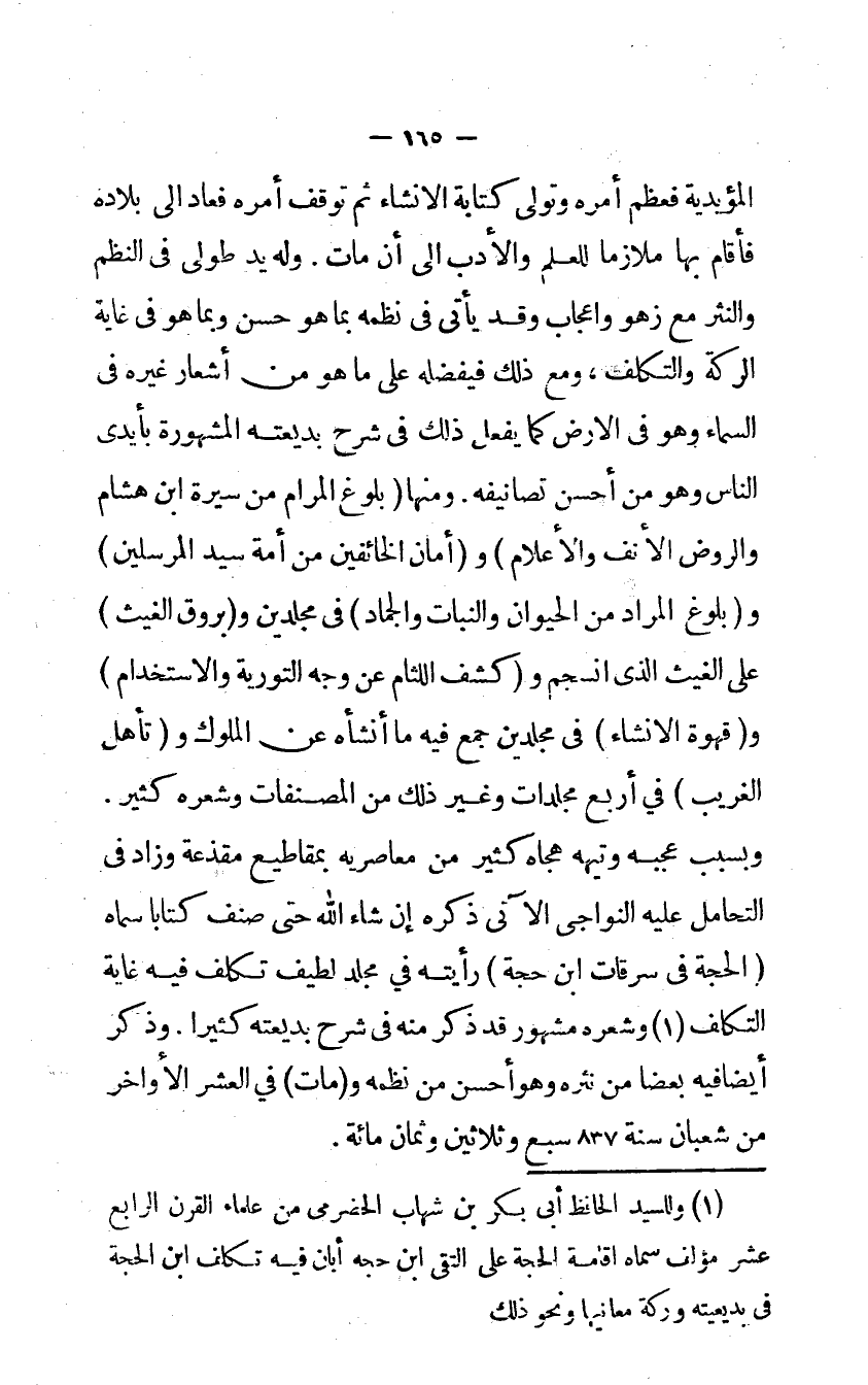 المؤيدية فَعظم أمره وَتَوَلَّى كِتَابَة الإنشاء ثمَّ توقف أمره فَعَاد إلى بِلَاده فَأَقَامَ بهَا ملازماً للْعلم وَالْأَدب إلى أَن مَاتَ وَله يَد طولى في النظم والنثر مَعَ زهو وإعجاب وَقد يأتي في نظمه بِمَا هُوَ حسن وَبِمَا هُوَ في غَايَة الركة والتكلف وَمَعَ ذَلِك فيفضله على ماهو من أشعار غَيره في السَّمَاء وَهُوَ في الأرض كَمَا يفعل ذَلِك في شرح بديعته الْمَشْهُورَة بأيدي النَّاس وَهُوَ من أحسن تصانيفه وَمِنْهَا بُلُوغ المرام من سيرة ابْن هِشَام وَالرَّوْض الْأنف والأعلام وأمان الْخَائِفِينَ من أمة سيد الْمُرْسلين وبلوغ المُرَاد من الْحَيَوَان والنبات والجماد في مجلدين وبروق الغبث على الْغَيْث الذى انسجم وكشف اللثام عَن وَجه التورية والاستخدام وقهوة الإنشاء في مجلدين جمع فِيهِ مَا أنشأه عَن الْمُلُوك وتأهل الْغَرِيب فِي أَربع مجلدات وَغير ذَلِك من المصنفات وشعره كثير وبسبب عجبه وتيهه هجاه كثير من معاصريه بمقاطيع مقذعة وَزَاد في التحامل عَلَيْهِ النواجي الآتي ذكره إِن شَاءَ الله حَتَّى صنّف كتاباً سَمَّاهُ الْحجَّة في سرقات ابْن حجَّة رَأَيْته فِي مُجَلد لطيف تكلف فِيهِ غَايَة التَّكَلُّف وشعره مَشْهُور قد ذكر مِنْهُ في شرح بديعته كثيراً وَذكر أَيْضا فِيهِ بَعْضًا من نثره وَهُوَ أحسن من نظمه وَمَات فِي الْعشْر الْأَوَاخِر من شعْبَان سنة 837 سبع وَثَلَاثِينَ وثمان مائَة