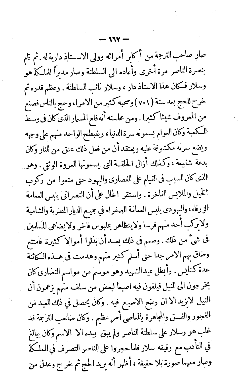 صَار صَاحب التَّرْجَمَة من أكَابِر أمرائه وَولى الأستاذ دارية لَهُ ثمَّ قَامَ بنصرة النَّاصِر مرة أُخْرَى وَأَعَادَهُ إلى السلطنة وَصَارَ مُدبرا للملكة هُوَ وسلار فَكَانَ هَذَا الاستاذ دَار وسلار نَائِب السلطنة وَعظم قدره ثمَّ خرج لِلْحَجِّ بعد سنة 701 وَصَحبه كثير من الأمراء وَحج بِالنَّاسِ فَصنعَ من الْمَعْرُوف شَيْئا كثيراً وَمن محاسنه أَنه قلع المسمار الَّذِي كَانَ في وسط الْكَعْبَة وَكَانَ الْعَوام يسمونه سرة الدُّنْيَا وينبطح الْوَاحِد مِنْهُم على وَجهه وَيَضَع سرته مكشوفة عَلَيْهِ ويعتقد أَن من فعل ذَلِك عتق من النَّار وَكَانَ بِدعَة شنيعة وَكَذَلِكَ أَزَال الْحلقَة الَّتِى يسمونها العروة الوثقى وَهُوَ الَّذِي كَانَ السَّبَب في الْقيام على النَّصَارَى وَالْيَهُود حَتَّى منعُوا من ركُوب الْخَيل والملابس الفاخرة وَاسْتقر الْحَال على أَن النصراني يلبس الْعِمَامَة الزَّرْقَاء واليهودي يلبس الْعِمَامَة الصَّفْرَاء فِي جَمِيع الديار المصرية والشامية وَلَا يركب أحد مِنْهُم فرساً وَلَا يتظاهر بملبوس فاخر وَلَا يضاهى الْمُسلمين فى شئ من ذَلِك وصمم في ذَلِك بعد أَن بذلوا أَمْوَالًا كَثِيرَة فَامْتنعَ وضاق بهم الأمر جداً حَتَّى أسلم كثير مِنْهُم وهدمت في هَذِه الكائنة عدَّة كنايس وأبطل عيد الشَّهِيد وَهُوَ موسم من مواسم النَّصَارَى كَانَ يخرجُون إلى النيل فيلقون فِيهِ أصبعاً لبَعض من سلف مِنْهُم يَزْعمُونَ أَن النيل لَا يزِيد إلا إن وضع الأصبع فِيهِ وَكَانَ يحصل فِي ذَلِك الْعِيد من الْفُجُور وَالْفِسْق والمجاهرة بالمعاصي أَمر عَظِيم وَكَانَ صَاحب التَّرْجَمَة قد غلب هُوَ وسلاّر على سلطنة النَّاصِر وَلم يبْق بِيَدِهِ إلا الِاسْم وَكَانَ يُبَالغ فِي التأدب مَعَ رَفِيقه سلار فَلَمَّا حجروا على النَّاصِر التَّصَرُّف فِي المملكة وَصَارَ مَعَهُمَا صُورَة بِلَا حَقِيقَة أظهر أَنه يُرِيد الْحَج ثمَّ خرج وَعدل من