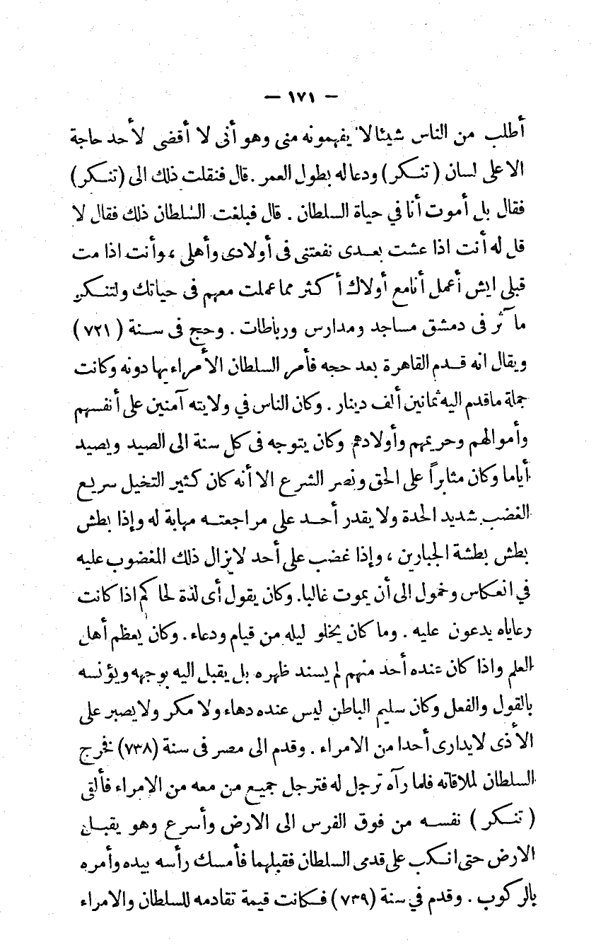 أطلب من النَّاس شَيْئا لَا يفهمونه مني وَهُوَ أَنى لَا أقضي لأحد حَاجَة إلا على لِسَان تنكر ودعا لَهُ بطول الْعُمر قَالَ فنقلت ذَلِك إلى تنكر فَقَالَ بل أَمُوت أَنا فِي حَيَاة السُّلْطَان قَالَ فبلغت السُّلْطَان ذَلِك فَقَالَ لَا قل لَهُ أَنْت إذا عِشْت بعدي نفعتني في أولادي وأهلي وَأَنت إذا مت قبلى ايش أعمل أنامع أولادك أَكثر مِمَّا عملت مَعَهم في حياتك ولتنكر مآثر في دمشق مَسَاجِد ومدارس ورباطات وَحج في سنة 721 وَيُقَال أنه قدم الْقَاهِرَة بعد حجة فَأمر السُّلْطَان الْأُمَرَاء يهادونه وَكَانَت جملَة مَا قدم اليه ثَمَانِينَ ألف دِينَار وَكَانَ النَّاس فِي ولَايَته آمِنين على أنفسهم وَأَمْوَالهمْ وحريمهم وَأَوْلَادهمْ وَكَانَ يتَوَجَّه في كل سنة إلى الصَّيْد ويصيد أَيَّامًا وَكَانَ مثابراً على الْحق وَنصر الشَّرْع إلا أَنه كَانَ كثير التخيل سريع الْغَضَب شَدِيد الحدة وَلَا يقدر أحد على مُرَاجعَته مهابة لَهُ وَإِذا بَطش بَطش بطشة الجبارين وَإِذا غضب على اُحْدُ لَا يزَال ذَلِك المغضوب عَلَيْهِ فِي انعكاس وخمول إلى أَن يَمُوت غَالِبا وَكَانَ يَقُول أي لَذَّة لحَاكم إذا كَانَت رعاياه يدعونَ عَلَيْهِ وَمَا كَانَ يَخْلُو ليلة من قيام وَدُعَاء وَكَانَ يعظم أهل الْعلم وإذا كَانَ عِنْده أحد مِنْهُم لم يسند ظَهره بل يقبل إليه بِوَجْهِهِ ويؤنسه بالْقَوْل وَالْفِعْل وَكَانَ سليم الْبَاطِن لَيْسَ عِنْده دهاء وَلَا مكر وَلَا يصبر على الْأَذَى لَا يداري أحداً من الأمراء وَقدم إلى مصر في سنة 738 فَخرج السُّلْطَان لملاقاته فَلَمَّا رَآهُ ترجل لَهُ فترجل جَمِيع من مَعَه من الامراء فَألْقى تنكر نَفسه من فَوق الْفرس إلى الأرض وأسرع وَهُوَ يقبل الأرض حَتَّى انكب على قدمي السُّلْطَان فقبلهما فأمسك رَأسه بِيَدِهِ وَأمره بالركوب وَقدم فِي سنة 739 فَكَانَت قيمَة تقادمه للسُّلْطَان والامراء