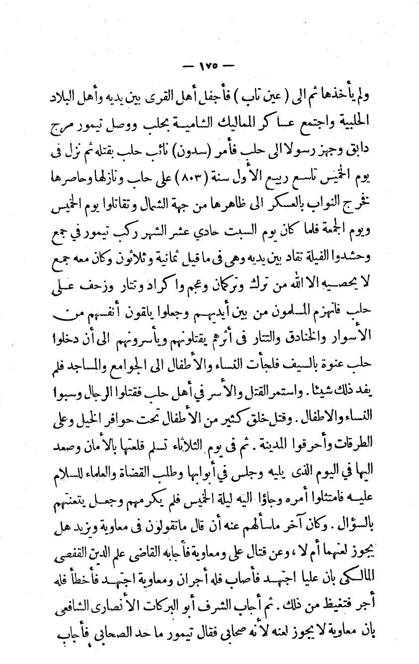 وَلم يَأْخُذهَا ثمَّ إلى عين تَابَ فأجفل أهل الْقرى بَين يَدَيْهِ وَأهل الْبِلَاد الحلبية وَاجْتمعَ عَسَاكِر المماليك الشامية بحلب وَوصل تيمور مرج دابق وجهز رَسُولا إلى حلب فَأمر سدون نَائِب حلب بقتْله ثمَّ نزل في يَوْم الْخَمِيس تَاسِع ربيع الأول سنة 803 على حلب ونازلها وحاصرها فَخرج النواب بالعسكر إلى ظَاهرهَا من جِهَة الشمَال وتقاتلوا يَوْم الْخَمِيس وَيَوْم الْجُمُعَة فَلَمَّا كَانَ يَوْم السبت حادي عشر الشَّهْر ركب تيمور فِي جمع وحشدوا الفيلة تقاد بَين يَدَيْهِ وهى فى مَا قيل ثَمَانِيَة وَثَلَاثُونَ وَكَانَ مَعَه جمع لَا يُحْصِيه إلا الله من ترك وتركمان وعجم وأكراد وتتار وزحف على حلب فَانْهَزَمَ الْمُسلمُونَ من بَين أَيْديهم وَجعلُوا يلقون أنفسهم من الأسوار والخنادق والتتار في أَثَرهم يَقْتُلُونَهُمْ ويأسرونهم إلى أَن دخلُوا حلب عنْوَة بِالسَّيْفِ فلجأت النِّسَاء والأطفال إلى الْجَوَامِع والمساجد فَلم يفد ذَلِك شَيْئا وَاسْتمرّ الْقَتْل والأسر فِي أهل حلب فَقتلُوا الرِّجَال وَسبوا النِّسَاء والأطفال وَقتل خلق كثير من الْأَطْفَال تَحت حوافر الْخَيل وعَلى الطرقات وأحرقوا الْمَدِينَة ثمَّ في يَوْم الثُّلَاثَاء تسلّم قلعتها بالأمان وَصعد إليها فِي الْيَوْم الَّذِي يَلِيهِ وَجلسَ فِي أَبْوَابهَا وَطلب الْقُضَاة وَالْعُلَمَاء للسلام عَلَيْهِ فامتثلوا أمره وجاؤا إليه لَيْلَة الْخَمِيس فَلم يكرمهم وَجعل يتعنتهم بالسؤال وَكَانَ اخر ماسألهم عَنهُ أن قَالَ مَا تَقولُونَ في مُعَاوِيَة وَيزِيد هَل يجوز لعنهما أم لَا وَعَن قتال علي وَمُعَاوِيَة فَأَجَابَهُ القاضي علم الدَّين القفصي المالكي بَان علياً اجْتهد فَأصَاب فَلهُ أَجْرَانِ وَمُعَاوِيَة اجْتهد فأحطأ فَلهُ أجر فتغيظ من ذَلِك ثمَّ أجَاب الشرف أَبُو البركات الأنصاري الشافعي بَان مُعَاوِيَة لَا يجوز لَعنه لِأَنَّهُ صحابي فَقَالَ تيمور مَا حد الصحابي فَأجَاب