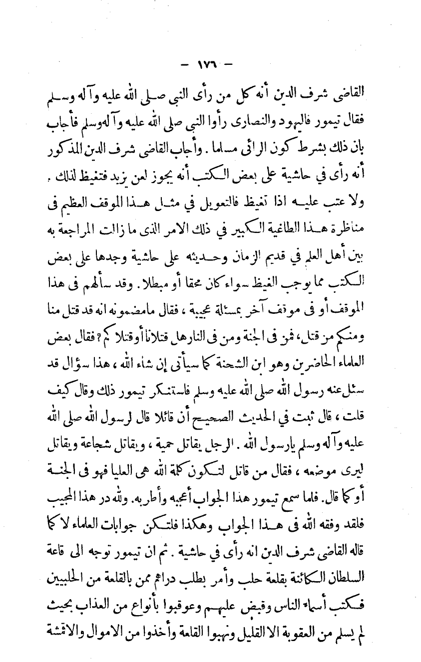 القاضي شرف الدَّين أَنه كل من رأى النبي صلى الله عَلَيْهِ وَآله وَسلم فَقَالَ تيمور فاليهود وَالنَّصَارَى رَأَوْا النبي صلى الله عَلَيْهِ وَآله وَسلم فَأجَاب بَان ذَلِك بِشَرْط كَون الرائي مُسلما وَأجَاب القاضي شرف الدَّين الْمَذْكُور أَنه رأى فِي حَاشِيَة على بعض الْكتب أَنه يجوز لعن يزِيد فتغيظ لذَلِك وَلَا عتب عَلَيْهِ إذا تغيّظ فالتعويل فِي مثل هَذَا الْموقف الْعَظِيم في مناظرة هَذَا الطاغية الْكَبِير فِي ذَلِك الامر الَّذِي مَا زَالَت الْمُرَاجَعَة بِهِ بَين أهل الْعلم فِي قديم الزَّمَان وَحَدِيثه على حَاشِيَة وجدهَا على بعض الْكتب مِمَّا يُوجب الغيظ سَوَاء كَانَ محقاً أَو مُبْطلًا وَقد سألهم في هَذَا الْموقف أَو فى موقف اخر بمسئلة عَجِيبَة فَقَالَ مَا مضمونه أنه قد قتل منا ومنكم من قتل فَمن في الْجنَّة وَمن في النَّار هَل قَتْلَانَا أَو قَتْلَاكُمْ فَقَالَ بعض الْعلمَاء الْحَاضِرين وَهُوَ ابْن الشّحْنَة كَمَا سيأتي إِن شَاءَ الله هَذَا سُؤال قد سُئِلَ عَنهُ رَسُول الله فاستنكر تيمور ذَلِك وَقَالَ كَيفَ قلت قَالَ ثَبت فِي الحَدِيث الصَّحِيح أَن قَائِلا قَالَ لرَسُول الله صلى الله عَلَيْهِ وَآله وَسلم يَا رَسُول الله الرجل يُقَاتل حمية وَقَاتل شجاعة وَيُقَاتل ليرى مَوْضِعه فَقَالَ من قَاتل لتَكون كلمة الله هي الْعليا فَهُوَ في الْجنَّة أَو كَمَا قَالَ فَلَمَّا سمع تيمور هَذَا الْجَواب أعجبه وأطربه وَللَّه در هَذَا الْمُجيب فَلَقَد وَفقه الله في هَذَا الْجَواب وَهَكَذَا فلتكن جوابات الْعلمَاء لَا كَمَا قَالَه القاضي شرف الدَّين أنه رأى فِي حَاشِيَة ثمَّ إن تيمور توجه إلى قاعة السُّلْطَان الكائنة بقلعة حلب وَأمر بِطَلَب دَرَاهِم مِمَّن بالقلعة من الحلبيين فَكتب أَسمَاء النَّاس وَقبض عَلَيْهِم وعوقبوا بانواع من الغذاب بِحَيْثُ لم يسلم من الْعقُوبَة إلا الْقَلِيل ونهبوا القلعة وَأخذُوا من الأموال والأقمشة