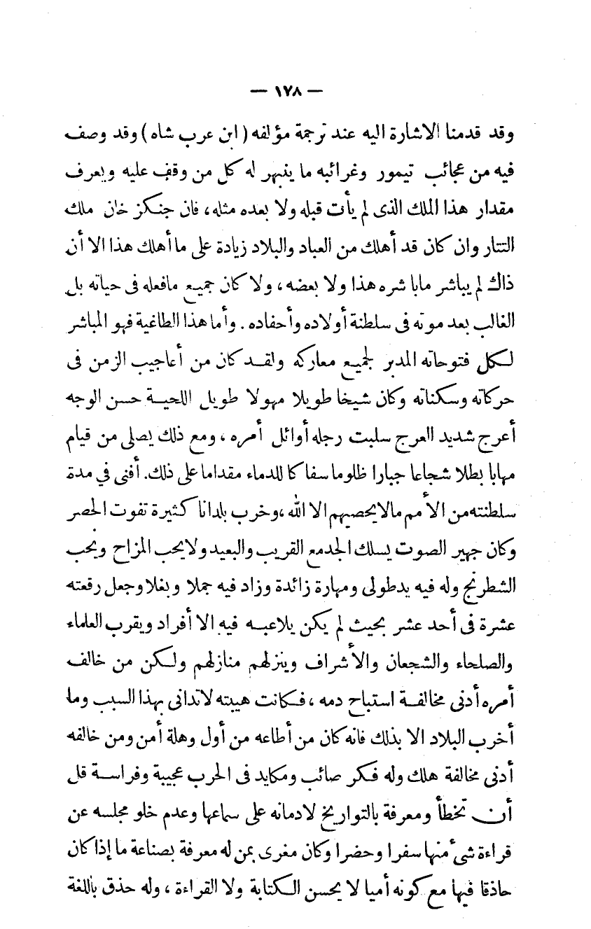 وَقد قدمنَا الإشارة إليه عِنْد تَرْجَمَة مُؤَلفه ابْن عرب شاه وَقد وصف فِيهِ من عجائب تيمور وغرائبه مَا ينبهر لَهُ كل من وقف عَلَيْهِ وَيعرف مِقْدَار هَذَا الْملك الَّذِي لم يَأْتِ قبله وَلَا بعده مثله فان جنكزخان ملك التتار وإن كَانَ قد أهلك من الْعباد والبلاد زِيَادَة على مَا أهلك هَذَا الا ان ذَاك لم يُبَاشر مابا شَره هَذَا وَلَا بعضه وَلَا كَانَ جَمِيع مافعله في حَيَاته بل الْغَالِب بعد مَوته في سلطنة أَوْلَاده وأحفاده وَأما هَذَا الطاغية فَهُوَ الْمُبَاشر لكل فتوحاته الْمُدبر لجَمِيع معاركه وَلَقَد كَانَ من أَعَاجِيب الزَّمن في حركاته وسكناته وَكَانَ شَيخا طَويلا مهولاً طَوِيل اللِّحْيَة حسن الْوَجْه أعرج شَدِيد العرج سلبت رجله أَوَائِل أمره وَمَعَ ذَلِك يصلى من قيام مهاباً بطلاً شجاعاً جباراً ظلوماً سفاكاً للدماء مقداماً على ذَلِك أفنى فِي مُدَّة سلطنته من الْأُمَم مَالا يحصيهم الا الله وَخرب بلدانا كَثِيرَة تفوت الْحصْر وَكَانَ جهير الصَّوْت يسْلك الْجد مَعَ الْقَرِيب والبعيد وَلَا يحب المزاح وَيُحب الشطرنج وَله فِيهِ يَد طولى ومهارة زَائِدَة وَزَاد فِيهِ جملاً وبغلاً وَجعل رقعته عشرَة في أحد عشر بِحَيْثُ لم يكن يلاعبه فِيهِ إلا أَفْرَاد وَيقرب الْعلمَاء والصلحاء والشجعان والأشراف وينزلهم مَنَازِلهمْ وَلَكِن من خَالف أمره أدنى مُخَالفَة استباح دَمه فَكَانَت هيبته لَا تدانى بِهَذَا السَّبَب وَمَا أخرب الْبِلَاد إلا بذلك فإنه كَانَ من أطاعه من أول وهلة أَمن وَمن خَالفه أدنى مُخَالفَة هلك وَله فكر صائب ومكايد في الْحَرْب عَجِيبَة وفراسة قلّ أَن تخطأ وَمَعْرِفَة بالتواريخ لإدمانه على سماعهَا وَعدم خلو مَجْلِسه عَن قِرَاءَة شئ مِنْهَا سفراً وحضراً وَكَانَ مغرى بِمن لَهُ معرفَة بصناعة مَا إِذا كَانَ حاذقاً فِيهَا مَعَ كَونه أميالا يحسن الْكِتَابَة وَلَا الْقِرَاءَة وَله حذق باللغة