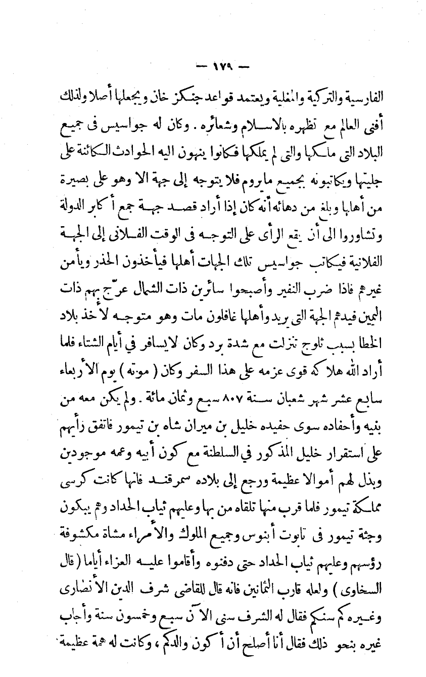 الفارسية والتركية والمغلية ويعتمد قَوَاعِد جنكزخان ويجعلها أصلاً وَلذَلِك أفنى الْعَالم مَعَ تظهره بالإسلام وشعائره وَكَانَ لَهُ جواسيس في جَمِيع الْبِلَاد الَّتِى ملكهَا والتي لم يملكهَا فَكَانُوا ينهون إليه الْحَوَادِث الكائنة على جليتها ويكاتبونه بِجَمِيعِ مَا يروم فَلَا يتَوَجَّه إِلَى جِهَة إلا وَهُوَ على بَصِيرَة من أَهلهَا وَبلغ من دهائه أَنه كَانَ إِذا أَرَادَ قصد جِهَة جمع أكَابِر الدولة وَتَشَاوَرُوا إلى أَن يَقع الرأي على التَّوَجُّه في الْوَقْت الفلاني إِلَى الْجِهَة الْفُلَانِيَّة فيكاتب جواسيس تِلْكَ الْجِهَات أَهلهَا فَيَأْخُذُونَ الحذر ويأمن غَيرهم فإذا ضرب النفير وَأَصْبحُوا سائرين ذَات الشمَال عرّج بهم ذَات الْيَمين فيدهم الْجِهَة الَّتِى يُرِيد وَأَهْلهَا غافلون مَاتَ وَهُوَ مُتَوَجّه لأخذ بِلَاد الخطا بِسَبَب ثلوج تنزلت مَعَ شدَّة برد وَكَانَ لَا يُسَافر فِي أَيَّام الشتَاء فَلَمَّا أَرَادَ الله هَلَاكه قوي عزمه على هَذَا السفر وَكَانَ مَوته يَوْم الْأَرْبَعَاء سَابِع عشر شهر شعْبَان سنة 807 سبع وثمان مائَة وَلم يكن مَعَه من بنيه وأحفاده سوى حفيده خَلِيل بن ميران شاه بن تيمور فاتفق رَأْيهمْ على اسْتِقْرَار خَلِيل الْمَذْكُور فِي السلطنة مَعَ كَون أَبِيه وَعَمه موجودين وبذل لَهُم أَمْوَالًا عَظِيمَة وَرجع إِلَى بِلَاده سَمَرْقَنْد فإنها كَانَت كرسي مملكة تيمور فَلَمَّا قرب مِنْهَا تَلقاهُ من بهَا وَعَلَيْهِم ثِيَاب الْحداد وهم يَبْكُونَ وجثة تيمور في تَابُوت أبنوس وَجَمِيع الْمُلُوك والأمراء مشَاة مكشوفة رُؤْسهمْ وَعَلَيْهِم ثِيَاب الْحداد حَتَّى دفنوه وَأَقَامُوا عَلَيْهِ العزاء أَيَّامًا قَالَ السخاوي وَلَعَلَّه قَارب الثَّمَانِينَ فإنه قَالَ للقاضي شرف الدَّين الأنصاري وَغَيره كم سنكم فَقَالَ لَهُ الشرف سني الْآن سبع وَخَمْسُونَ سنة وَأجَاب غَيره بِنَحْوِ ذَلِك فَقَالَ أَنا أصلح أَن أكون والدكم وَكَانَت لَهُ همة عَظِيمَة