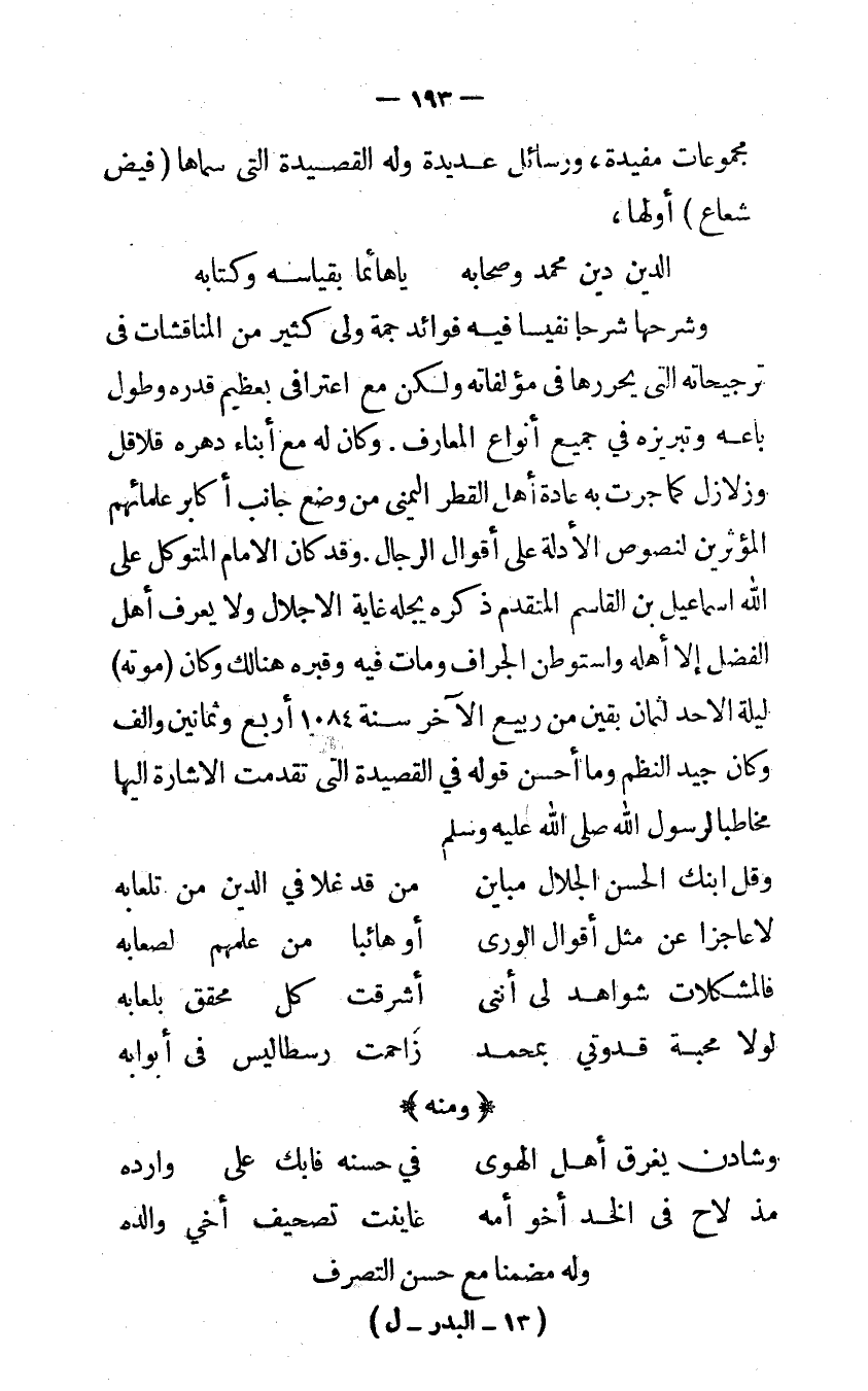 وَشَرحهَا شرحاً نفيساً فِيهِ فَوَائِد جمة ولي كثير من المناقشات في ترجيحاته الَّتِى يحررها في مؤلفاته وَلَكِن مَعَ اعترافي بعظيم قدره وَطول بَاعه وتبريزه فِي جَمِيع أَنْوَاع المعارف وَكَانَ لَهُ مَعَ أبناء دهره قلاقل وزلازل كَمَا جرت بِهِ عَادَة أهل الْقطر الْيُمْنَى من وضع جَانب أكَابِر عُلَمَائهمْ المؤثرين لنصوص الْأَدِلَّة على أَقْوَال الرِّجَال وَقد كَانَ الإمام المتَوَكل على الله إسماعيل بن الْقَاسِم الْمُتَقَدّم ذكره يجلّه غَايَة الإجلال وَلَا يعرف أهل الْفضل إِلَّا أَهله واستوطن الجراف وَمَات فِيهِ وقبره هُنَالك وَكَانَ مَوته لَيْلَة الأحد لثمان بَقينَ من ربيع الآخر سنة 1084 أَربع وَثَمَانِينَ وألف وَكَانَ جيد النظم وَمَا أحسن قَوْله فِي القصيدة الَّتِى تقدمت الإشارة إليها مُخَاطبا لرَسُول الله صلى الله عَلَيْهِ وَسلم