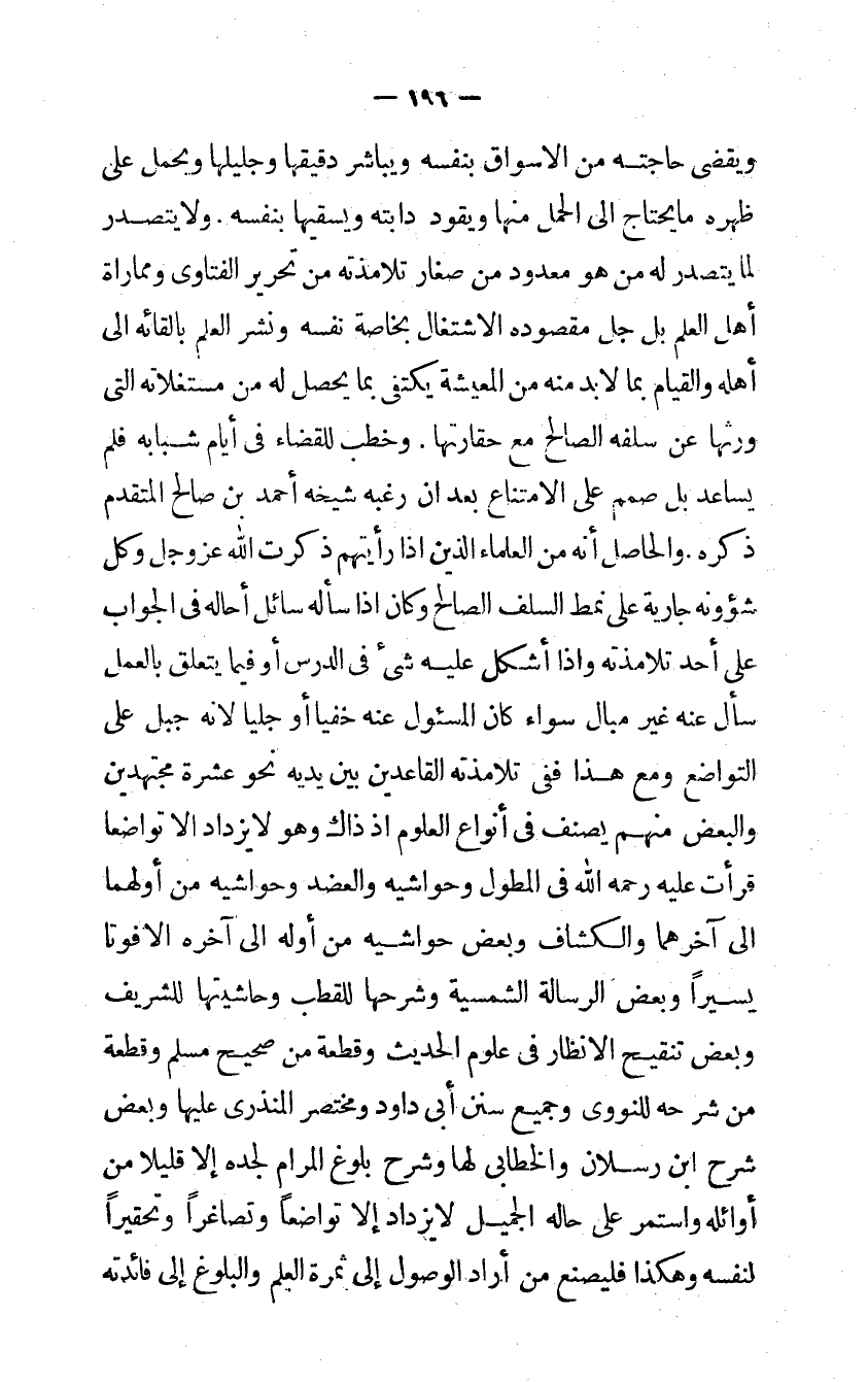 وَيقْضى حَاجته من الأسواق بِنَفسِهِ ويباشر دقيقها وجليلها وَيحمل على ظَهره مَا يحْتَاج الى الْحمل مِنْهَا ويقود دَابَّته ويسقيها بِنَفسِهِ وَلَا يتصدر لما يتصدر لَهُ من هُوَ مَعْدُود من صغَار تلامذته من تَحْرِير الْفَتَاوَى ومماراة أهل الْعلم بل جلّ مَقْصُوده الِاشْتِغَال بِخَاصَّة نَفسه وَنشر الْعلم بإلقائه إلى أَهله وَالْقِيَام بِمَا لَا بُد مِنْهُ من المعيشة يكْتَفى بِمَا يحصل لَهُ من مستغلاته الَّتِى ورثهَا عَن سلفه الصَّالح مَعَ حقارتها وخطب للْقَضَاء في أَيَّام شبابه فَلم يساعد بل صمم على الِامْتِنَاع بعد أن رغبّه شَيْخه أَحْمد بن صَالح الْمُتَقَدّم ذكره وَالْحَاصِل أَنه من الْعلمَاء الَّذين اذا رَأَيْتهمْ ذكرت الله عز وَجل وكل شؤونه جَارِيَة على نمط السلف الصَّالح وَكَانَ إذا سَأَلَهُ سَائل أَحَالهُ في الْجَواب على أحد تلامذته واذا أشكل عَلَيْهِ شئ في الدَّرْس اَوْ فِيمَا يتَعَلَّق بِالْعَمَلِ سَأَلَ عَنهُ غير مبال سَوَاء كَانَ الْمَسْئُول عَنهُ خفِيا أَو جلياً لأنه جبل على التَّوَاضُع وَمَعَ هَذَا ففي تلامذته القاعدين بَين يَدَيْهِ نَحْو عشرَة مجتهدين وَالْبَعْض مِنْهُم يصنّف في أَنْوَاع الْعُلُوم إذ ذَاك وَهُوَ لَا يزْدَاد الا تواضعا قَرَأت عَلَيْهِ رَحمَه الله في المطوّل وحواشيه والعضد وحواشيه من أَولهمَا إلى آخرهما والكشاف وَبَعض حَوَاشِيه من أَوله إلى آخِره إلا فوتاً يَسِيرا وَبَعض الرسَالَة الشمسية وَشَرحهَا للقطب وحاشيتها للشريف وَبَعض تَنْقِيح الأنظار في عُلُوم الحَدِيث وقطعة من صَحِيح مُسلم وقطعة من شَرحه للنووي وَجَمِيع سنَن أَبى دَاوُد ومختصر المنذري عَلَيْهَا وَبَعض شرح ابْن رسْلَان والخطابي لَهَا وَشرح بُلُوغ المرام لجده إِلَّا قَلِيلا من أَوَائِله وَاسْتمرّ على حَاله الْجَمِيل لَا يزْدَاد إِلَّا تواضعا وتصاغرا وتحقيرا لنَفسِهِ وَهَكَذَا فليصنع من أَرَادَ الْوُصُول إِلَى ثَمَرَة الْعلم وَالْبُلُوغ إِلَى فَائِدَته