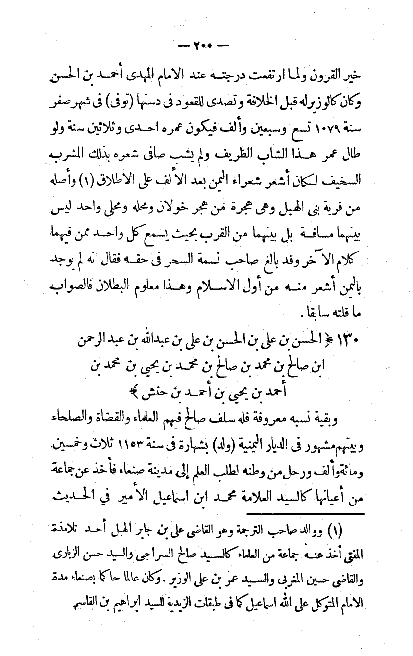 خير الْقُرُون وَلما ارْتَفَعت دَرَجَته عِنْد الإمام المهدي أَحْمد بن الْحسن وَكَانَ كالوزير لَهُ قبل الْخلَافَة وتصدى للقعود في دستها توفي في شهر صفر سنة 1079 تسع وَسبعين وَألف فَيكون عمره احدى وَثَلَاثِينَ سنة وَلَو طَال عمر هَذَا الشَّاب الظريف وَلم يشب صافى شعره بذلك المشرب السخيف لَكَانَ أشعر شعراء الْيمن بعد الْألف على الاطلاق وَأَصله من قَرْيَة بنى الهبل وهي هِجْرَة من هجر خولان وَمحله ومحلي وَاحِد لَيْسَ بَينهمَا مَسَافَة بل بَينهمَا من الْقرب بِحَيْثُ يسمع كل وَاحِد مِمَّن فيهمَا كَلَام الآخر وَقد بَالغ صَاحب نسمَة السحر في حَقه فَقَالَ إنه لم يُوجد بِالْيمن اشعر مِنْهُ من أول الإسلام وَهَذَا مَعْلُوم الْبطلَان فَالصَّوَاب مَا قلته سَابِقًا