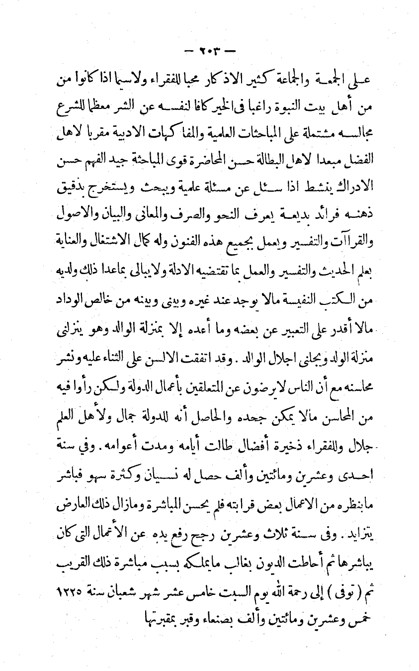على الْجُمُعَة وَالْجَمَاعَة كثير الأذكار محباً للْفُقَرَاء وَلَا سِيمَا إذا كَانُوا من أهل بَيت النُّبُوَّة رَاغِبًا في الْخَيْر كافاً لنَفسِهِ عَن الشَّرّ مُعظما للشَّرْع مجالسه مُشْتَمِلَة على المباحثات العلمية والمفاكهات الأدبية مقرباً لأهل الْفضل مُبْعدًا لأهل البطالة حسن المحاضرة قوي المباحثة جيد الْفَهم حسن الادراك ينشط اذا سُئِلَ عَن مسئلة علمية ويبحث ويستخرج بدقيق ذهنه فرائد بديعة يعرف النَّحْو وَالصرْف والمعاني وَالْبَيَان والأصول والقراآت وَالتَّفْسِير وَيعْمل بِجَمِيعِ هَذِه الْفُنُون وَله كَمَال الِاشْتِغَال والعناية بِعلم الحَدِيث وَالتَّفْسِير وَالْعَمَل بِمَا تَقْتَضِيه الأدلة وَلَا يبالي بِمَا عدا ذَلِك ولديه من الْكتب النفيسة مَالا يُوجد عِنْد غَيره وبيني وَبَينه من خَالص الوداد مَالا أقدر على التَّعْبِير عَن بعضه وَمَا أعده إِلَّا بِمَنْزِلَة الْوَالِد وَهُوَ ينزلني منزلَة الْوَلَد ويجلّني إجلال الْوَالِد وَقد اتفقت الألسن على الثَّنَاء عَلَيْهِ وَنشر محاسنه مَعَ أَن النَّاس لَا يرضون عَن المتعلقين بأعمال الدولة وَلَكِن رَأَوْا فِيهِ من المحاسن مَالا يُمكن جَحده وَالْحَاصِل أَنه للدولة جمال وَلأَهل الْعلم جلال وللفقراء ذخيرة أفضال طَالَتْ أَيَّامه ومدت أعوامه وَفِي سنة إحدى وَعشْرين وَمِائَتَيْنِ وَألف حصل لَهُ نِسْيَان وَكَثْرَة سَهْو فباشر مَا بنظره من الأعمال بعض قرَابَته فَلم يحسن الْمُبَاشرَة وَمَا زَالَ ذَلِك الْعَارِض يتزايد وفي سنة ثَلَاث وَعشْرين رجح رفع يَده عَن الْأَعْمَال الَّتِى كَانَ يُبَاشِرهَا ثمَّ أحاطت الدُّيُون بغالب مَا يملكهُ بِسَبَب مُبَاشرَة ذَلِك الْقَرِيب ثمَّ توفي إِلَى رَحْمَة الله يَوْم السبت خَامِس عشر شهر شعْبَان سنة 1225 خمس وَعشْرين وَمِائَتَيْنِ وَألف بِصَنْعَاء وقبر بمقبرتها
