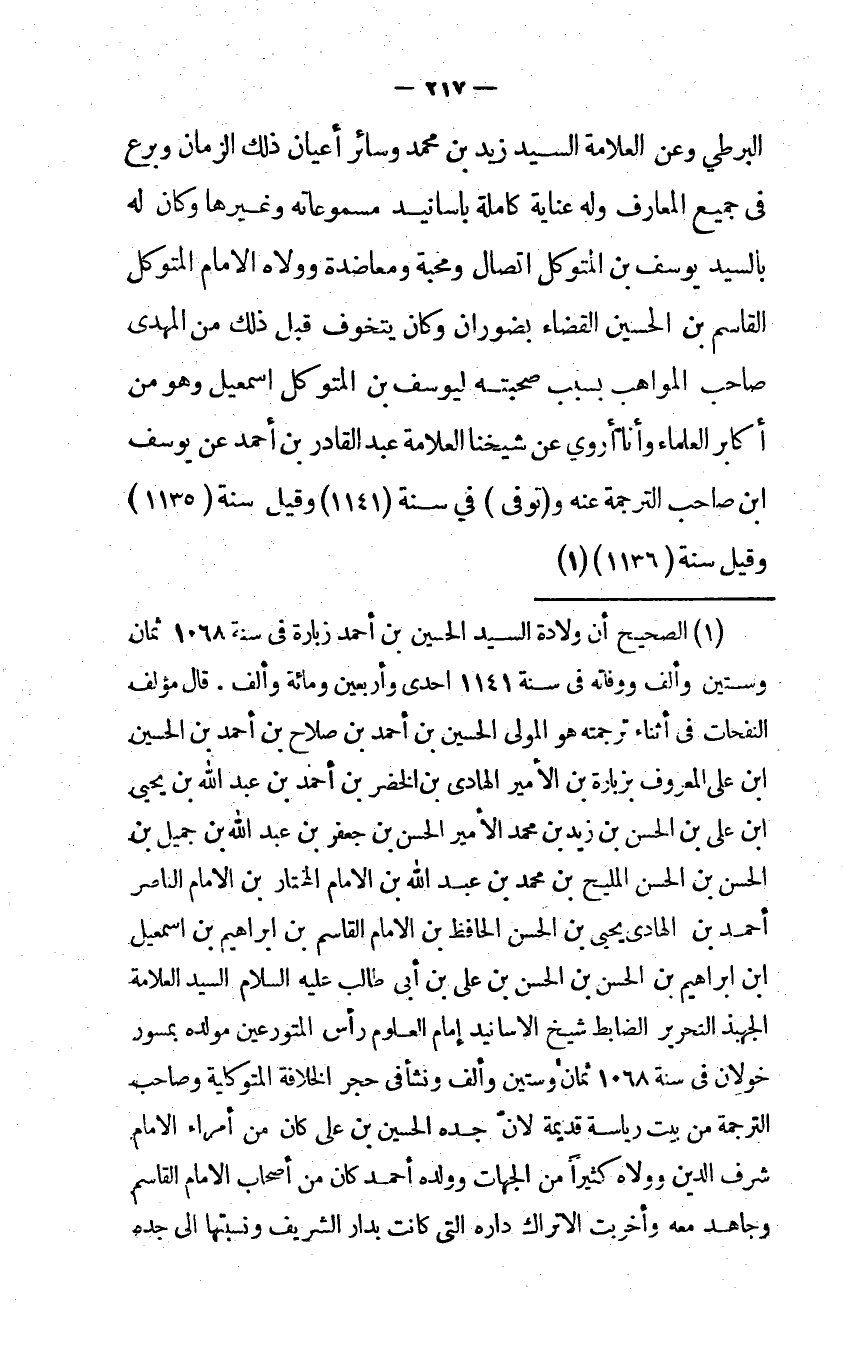 البرطي وَعَن الْعَلامَة السَّيِّد زيد بن مُحَمَّد وَسَائِر أَعْيَان ذَلِك الزَّمَان وبرع فى جَمِيع المعارف وَله عناية كَامِلَة بأسانيد مسموعاته وَغَيرهَا وَكَانَ لَهُ بالسيّد يُوسُف بن المتَوَكل اتِّصَال ومحبة ومعاضدة وولاه الإمام المتَوَكل الْقَاسِم بن الْحُسَيْن الْقَضَاء بضوران وَكَانَ يتخوف قبل ذَلِك من المهدي صَاحب الْمَوَاهِب بِسَبَب صحبته ليوسف بن المتَوَكل اسمعيل وَهُوَ من أكَابِر الْعلمَاء وَأَنا أروي عَن شَيخنَا الْعَلامَة عبد الْقَادِر بن أَحْمد عَن يُوسُف ابْن صَاحب التَّرْجَمَة عَنهُ وَتوفى فِي سنة 1141 وَقيل سنة 1135 وَقيل سنة 1136