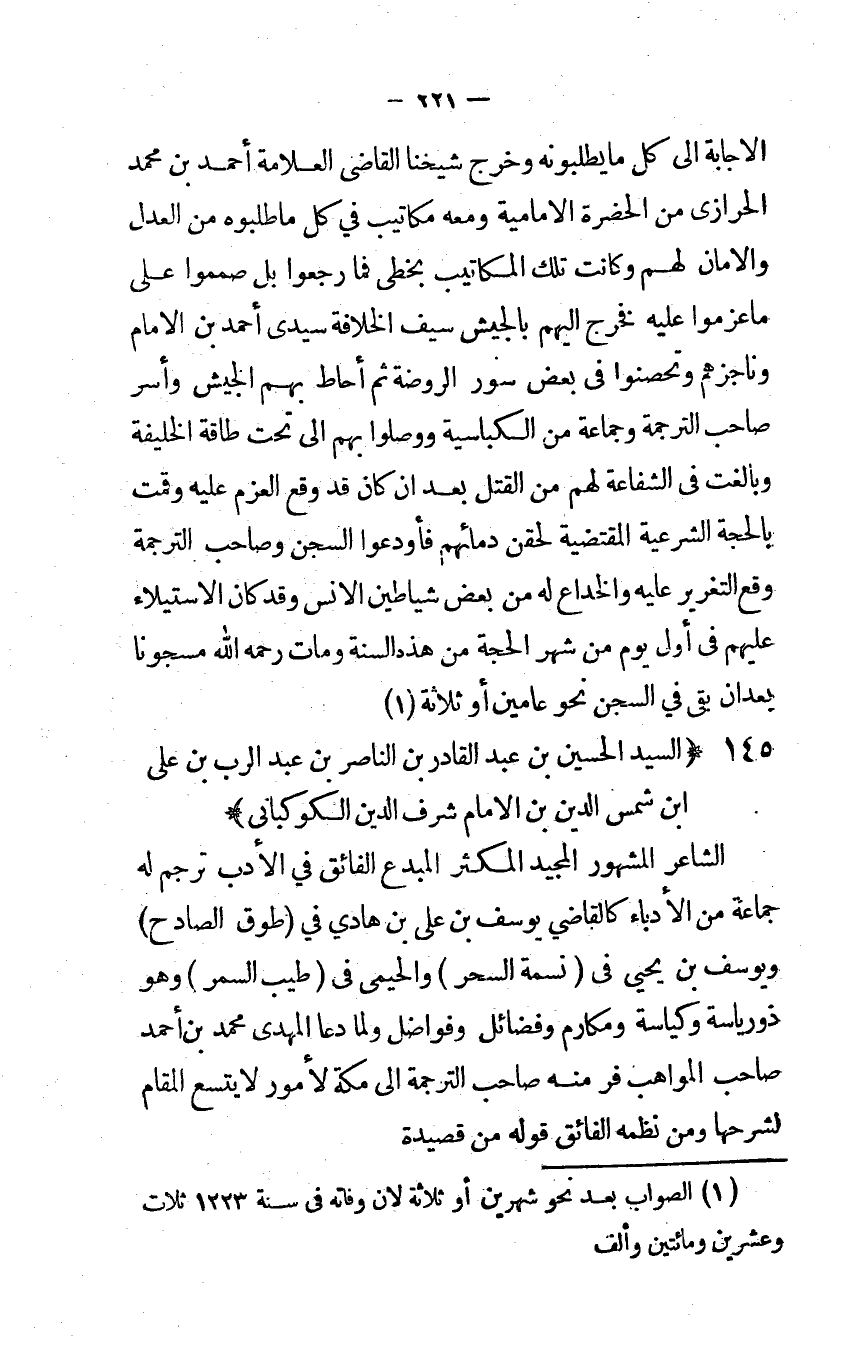 الإجابة إلى كل مَا يطلبونه وَخرج شَيخنَا القاضي الْعَلامَة أَحْمد بن مُحَمَّد الحرازي من الحضرة الإمامية وَمَعَهُ مكاتيب فِي كل مَا طلبوه من الْعدْل والأمان لَهُم وَكَانَت تِلْكَ المكاتيب بخطي فَمَا رجعُوا بل صمموا على ماعزموا عَلَيْهِ فَخرج إليهم بالجيش سيف الْخلَافَة سيدي أَحْمد بن الإمام وناجزهم وتحصّنوا في بعض سور الرَّوْضَة ثمَّ أحَاط بهم الْجَيْش وَأسر صَاحب التَّرْجَمَة وَجَمَاعَة من الكباسية ووصلوا بهم إلى تَحت طَاقَة الْخَلِيفَة وبالغت في الشَّفَاعَة لَهُم من الْقَتْل بعد أن كَانَ قد وَقع الْعَزْم عَلَيْهِ وَقمت بِالْحجَّةِ الشَّرْعِيَّة الْمُقْتَضِيَة لحقن دِمَائِهِمْ فأودعوا السجْن وَصَاحب التَّرْجَمَة وَقع التَّغْرِير عَلَيْهِ وَالْخداع لَهُ من بعض شياطين الإنس وَقد كَانَ الِاسْتِيلَاء عَلَيْهِم في أول يَوْم من شهر الْحجَّة من هَذِه السنة وَمَات رَحمَه الله مسجونا بعدان بقي فِي السجْن نَحْو عَاميْنِ أَو ثَلَاثَة