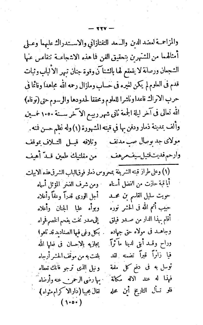 والمزاحمة لعضد الدَّين والسعد التَّفْتَازَانِيّ والاستدراك عَلَيْهِمَا وعَلى أمثالهما من المشتهرين بتحقيق الْفَنّ فَمَا هَذِه الاشجاعة تتقاعس عَنْهَا الشجعان ورصانة لَا يقعقع لَهَا بالشنآن وَقُوَّة جنان تبهر الْأَلْبَاب وثبات قدم في الْعُلُوم لم يكن لغيره في حِسَاب ومازال رَحمَه الله مُجَاهدًا وَقَائِمًا فى حَرْب الاتراك قَاعِدا وناشراً للعلوم ومحققاً لحدودها والرسوم حَتَّى توفاه الله تَعَالَى في آخر لَيْلَة الْجُمُعَة ثاني شهر ربيع الآخر سننة 1050 خمسين وَألف بِمَدِينَة ذمار وَدفن بهَا فِي قُبَّته الْمَشْهُورَة وَله نظم حسن فَمِنْهُ