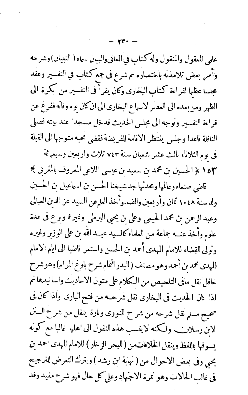 قَاضِي صنعاء وعالمها ومحدثها جد شَيخنَا الْحسن بن إسماعيل بن الْحُسَيْن ولد سنة 1048 ثَمَان وَأَرْبَعين وألف وَأخذ الْعلم عَن السَّيِّد عز الدَّين العبّالي وَعبد الرَّحْمَن بن مُحَمَّد الحيمي وعَلى بن يحيى البرطى وَغَيرهم وبرع في عدَّة عُلُوم وَأخذ عَنهُ جمَاعَة من الْعلمَاء كالسيّد عبد الله بن علي الْوَزير وَغَيره وَتَوَلَّى الْقَضَاء للإمام المهدي احْمَد بن الْحسن وَاسْتمرّ قَاضِيا إلى أيام الإمام المهدي مُحَمَّد بن احْمَد وَهُوَ مُصَنف الْبَدْر التَّمام شرح بُلُوغ المرام وَهُوَ شرح حافل نقل مَا فِي التَّلْخِيص من الْكَلَام على متون الأحاديث وأسانيدها ثمَّ إذا كَانَ الحَدِيث في البخاري نقل شَرحه من فتح الباري وإذا كَانَ فى صَحِيح مُسلم نقل شَرحه من شرح النووي وَتارَة ينْقل من شرح السّنَن لِابْنِ رسْلَان وَلكنه لَا ينْسب هَذِه النقول الى اهلها غَالِبا مَعَ كَونه يَسُوقهَا بِاللَّفْظِ وينقل الخلافات من الْبَحْر الزخار للإمام المهدي احْمَد بن يحيى وفي بعض الأحوال من نِهَايَة ابْن رشد وَيتْرك التَّعَرُّض للترجيح في غَالب الْحَالَات وَهُوَ ثَمَرَة الِاجْتِهَاد وعَلى كل حَال فَهُوَ شرح مُفِيد وَقد