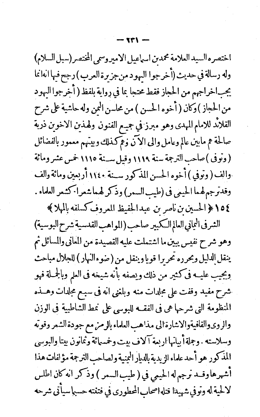اخْتَصَرَهُ السَّيِّد الْعَلامَة مُحَمَّد بن إسماعيل الأمير وسمى الْمُخْتَصر سبل السَّلَام وَله رِسَالَة فِي حَدِيث أخرجُوا الْيَهُود من جَزِيرَة الْعَرَب رجح فِيهَا إنه إنما يجب إخراجهم من الْحجاز فَقَط محتجاً بِمَا فِي رِوَايَة بِلَفْظ أخرجُوا الْيَهُود من الْحجاز وَكَانَ أَخُوهُ الْحسن من محَاسِن الْيمن وَله حَاشِيَة على شرح القلائد للإمام المهدي وَهُوَ مبرز فِي جَمِيع الْفُنُون ولهذين الأخوين ذُرِّيَّة صَالِحَة هم مَا بَين عَالم وعامل وإلى الْآن وهم كَذَلِك وبيتهم معمور بالفضائل وَتوفى صَاحب التَّرْجَمَة سنة 1119 وَقيل سنة 1115 خمس عشر وَمِائَة وألف وَتُوفِّي أَخُوهُ الْحسن الْمَذْكُور سنة 1140 أَرْبَعِينَ وَمِائَة وألف وَقد ترْجم لَهما الحيمي في طيب السمر وَذكر لَهما شعرًا كشعر الْعلمَاء