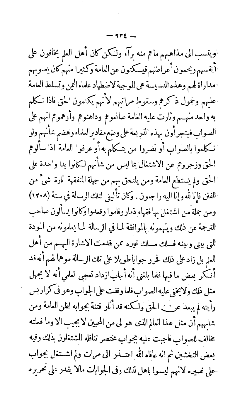 وينسب الى مذاهبهم ماهم مِنْهُ بُرَآء وَلَكِن كَانَ أهل الْعلم يخَافُونَ على أنفسهم ويحمون أعراضهم فيسكتون عَن الْعَامَّة وَكَثِيرًا مِنْهُم كَانَ يصوبهم مداراة لَهُم وَهَذِه الدسيسة هي الْمُوجبَة لاضطهاد عُلَمَاء الْيمن وتسلط الْعَامَّة عَلَيْهِم وخمول ذكرهم وَسُقُوط مَرَاتِبهمْ لأَنهم يكتمون الْحق فإذا تكلم بِهِ وَاحِد مِنْهُم وثارت عَلَيْهِ الْعَامَّة صانعوهم وداهنوهم وأوهموهم إنهم على الصَّوَاب فيتجرأون بِهَذِهِ الذريعة على وضع مقادير الْعلمَاء وهضم شَأْنهمْ وَلَو تكلمُوا بِالصَّوَابِ أَو نصروا من يتَكَلَّم بِهِ أَو عرفُوا الْعَامَّة إذا سألوهم الْحق وزجروهم عَن الِاشْتِغَال بِمَا لَيْسَ من شَأْنهمْ لكانو يداً وَاحِدَة على الْحق وَلم يسْتَطع الْعَامَّة وَمن يلْتَحق بهم من جهلة المتفقهة اثارة شئ من الْفِتَن فَإنَّا لله وَإِنَّا إليه رَاجِعُون وَكَانَ تأليفى لتِلْك الرسلة فِي سنة 1208 وَمن جملَة من اشْتغل بهَا فُقَهَاء ذمار وَقَامُوا وقعدوا وكانو يسْأَلُون صَاحب التَّرْجَمَة عَن ذَلِك ويتهمونه بالموافقة لما في الرسَالَة لما يعلمونه من الْمَوَدَّة الَّتِى بيني وَبَينه فسلك مَسْلَك غَيره مِمَّن قدمت الإشارة إليهم من أهل الْعلم بل زَاد على ذَلِك فحرر جَوَابا طَويلا على تِلْكَ الرسَالَة موهماً لَهُم أَنه قد أنكر بعض مَا فِيهَا فَلَمَّا بلغني أَنه أجَاب ازْدَادَ تعجبي لعلمي أَنه لَا يجهل مثل ذَلِك وَلَا يخفى عَلَيْهِ الصَّوَاب فَلَمَّا وقفت على الْجَواب وَهُوَ في كراريس رَأَيْته لم يبعد عَن الْحق وَلكنه قد أثار فتْنَة بجوابه لظن الْعَامَّة وَمن شابههم أَن مثل هَذَا الْعَالم الَّذِي هُوَ لى من المجين لَا يُجيب إلا وَمَا فعلته مُخَالف للصَّوَاب فأجبت عَلَيْهِ بِجَوَاب مُخْتَصر تناقله المشتغلون بذلك وَفِيه بعض التخشين ثمَّ إنه عافاه الله اعتذر إليّ مَرَّات وَلم اشْتغل بِجَوَاب على غَيره لأَنهم لَيْسُوا بَاهل لذَلِك وفي الجوابات مَالا يقدر على تحريره