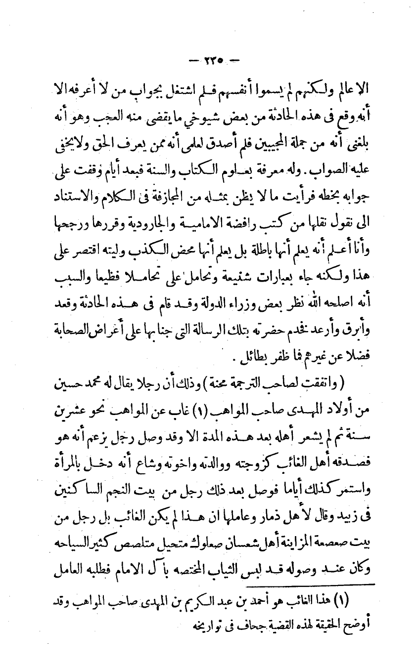 إلا عَالم وَلَكنهُمْ لم يسموا أنفسهم فَلم اشْتغل بِجَوَاب من لَا أعرفهُ إلا أَنه وَقع في هَذِه الْحَادِثَة من بعض شيوخي مَا يقْضى مِنْهُ الْعجب وَهُوَ أَنه بلغني أَنه من جملَة المجيبين فَلم اصدق لعلمي أَنه مِمَّن يعرف الْحق وَلَا يخفى عَلَيْهِ الصَّوَاب وَله معرفَة بعلوم الْكتاب وَالسّنة فَبعد أَيَّام وقفت على جَوَابه بِخَطِّهِ فَرَأَيْت مَالا يظن بِمثلِهِ من المجازفة في الْكَلَام والاستناد إلى نقُول نقلهَا من كتب رافضة الإمامية والجارودية وقررها ورجحها وَأَنا أعلم أَنه يعلم أَنَّهَا بَاطِلَة بل يعلم أَنَّهَا مَحْض الْكَذِب وليته اقْتصر على هَذَا وَلكنه جَاءَ بعبارات شنيعة وتحامل عليّ تحاملاً فظيعاً وَالسَّبَب أَنه أصلحه الله نظر بعض وزارء الدولة وَقد قَامَ في هَذِه الْحَادِثَة وَقعد وأبرق وأرعد فخدم حَضرته بِتِلْكَ الرسَالَة الَّتِى جنابها على أَعْرَاض الصَّحَابَة فضلاً عَن غَيرهم فَمَا ظفر بطائل